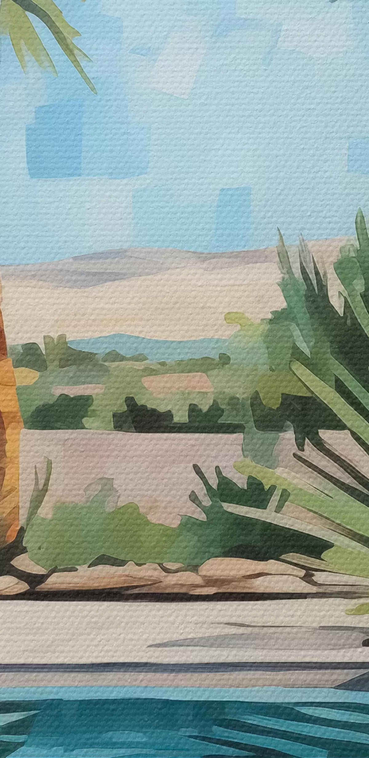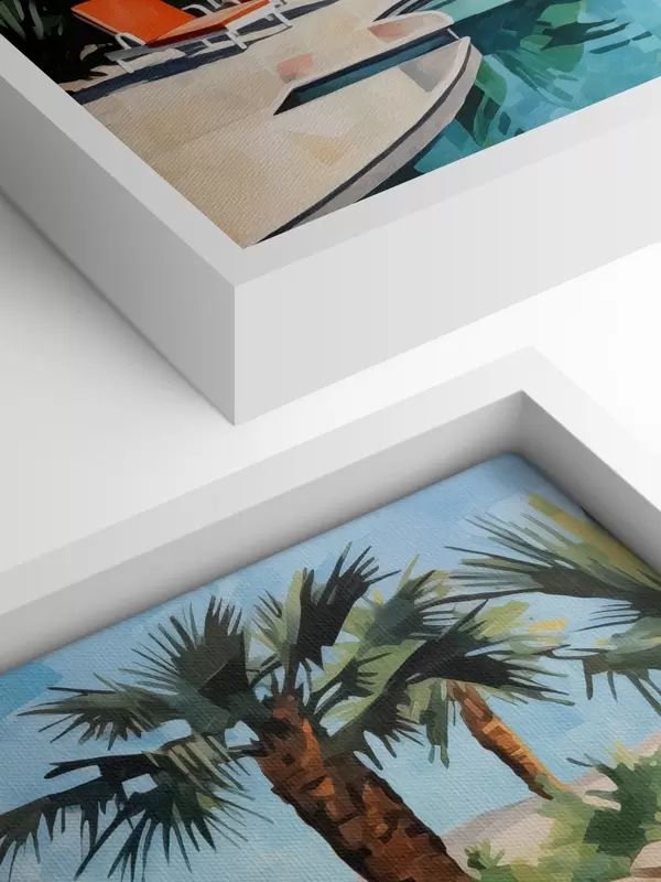 Pictură pe pânză Palmieri lângă hotel cu o piscină lângă stânci, albastru, verde, roșu culoare Nr s40748