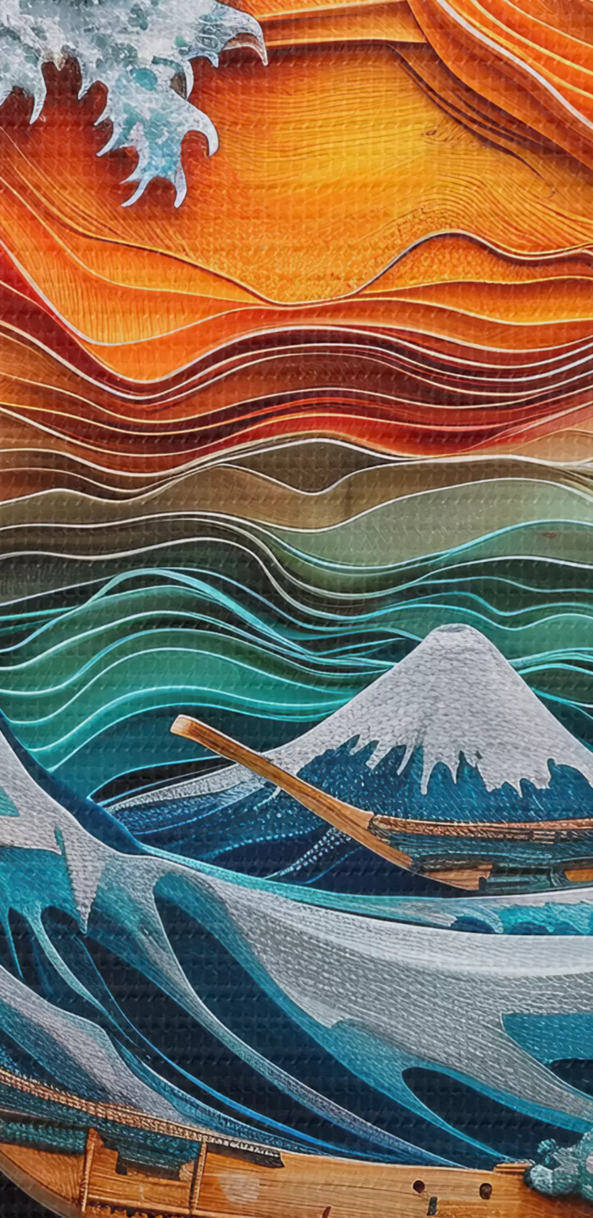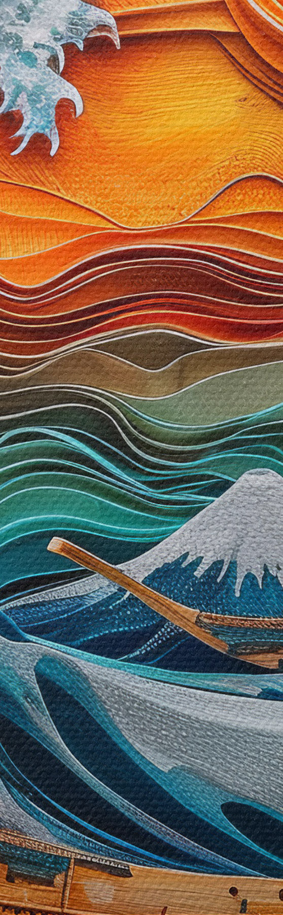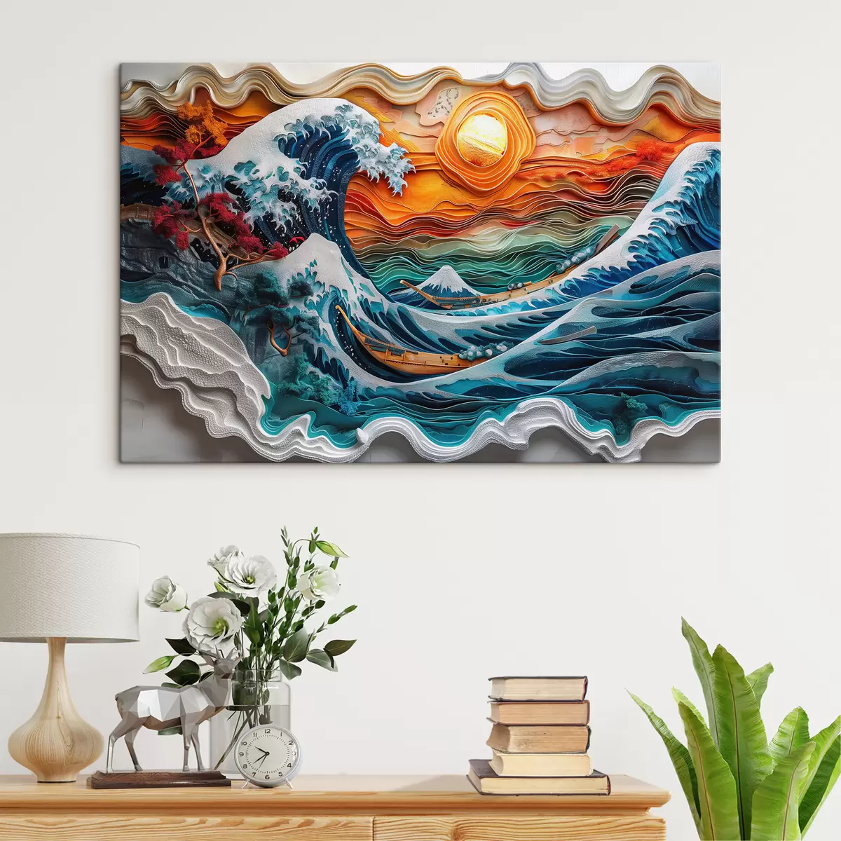 Pictură pe pânză Imitație basorelief: un ocean învolburat cu bărci și soare Nr s40976