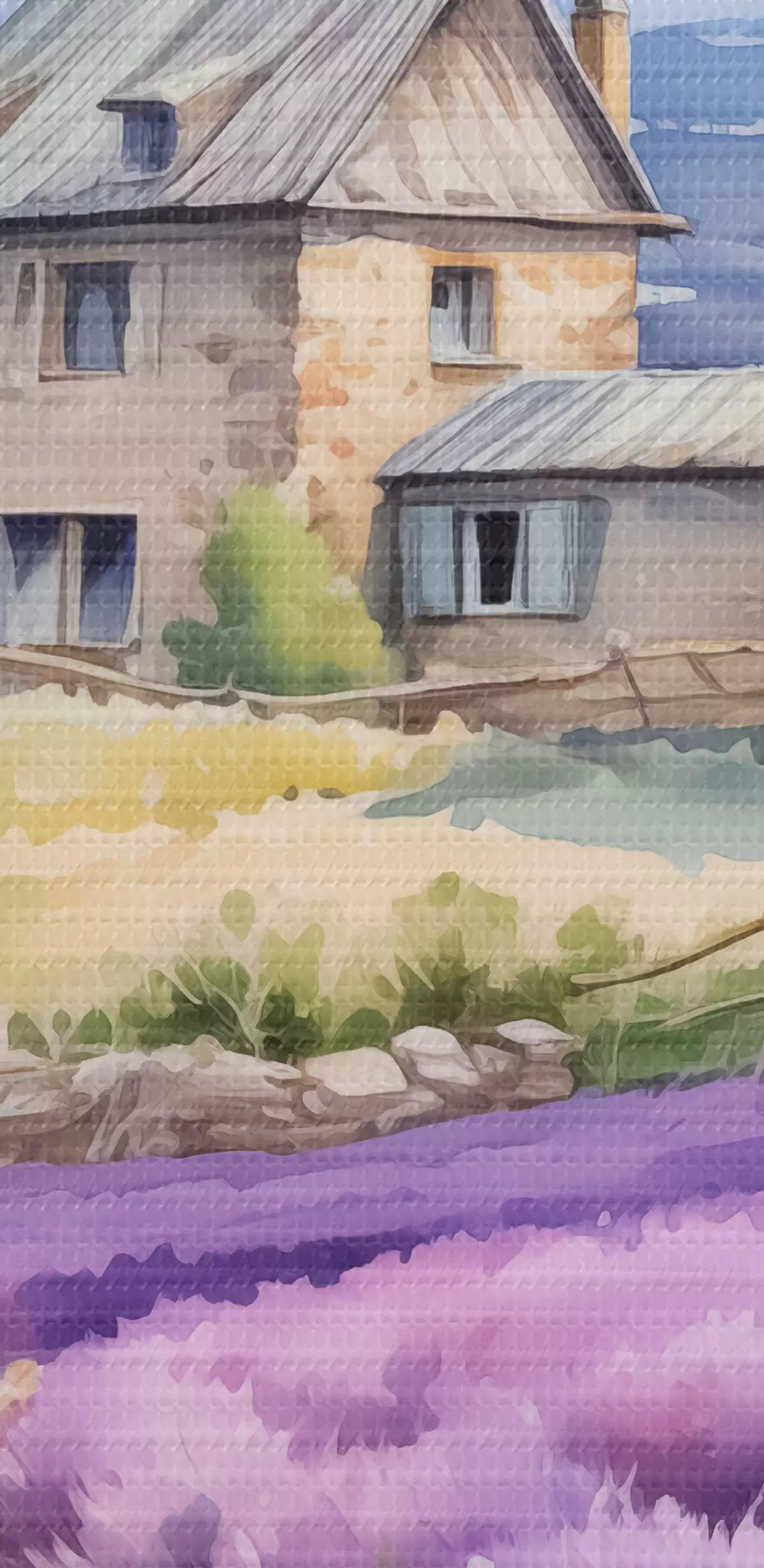 Pictură pe pânză Casă de țară cu munți în fundal lângă un câmp de lavandă Nr s41012