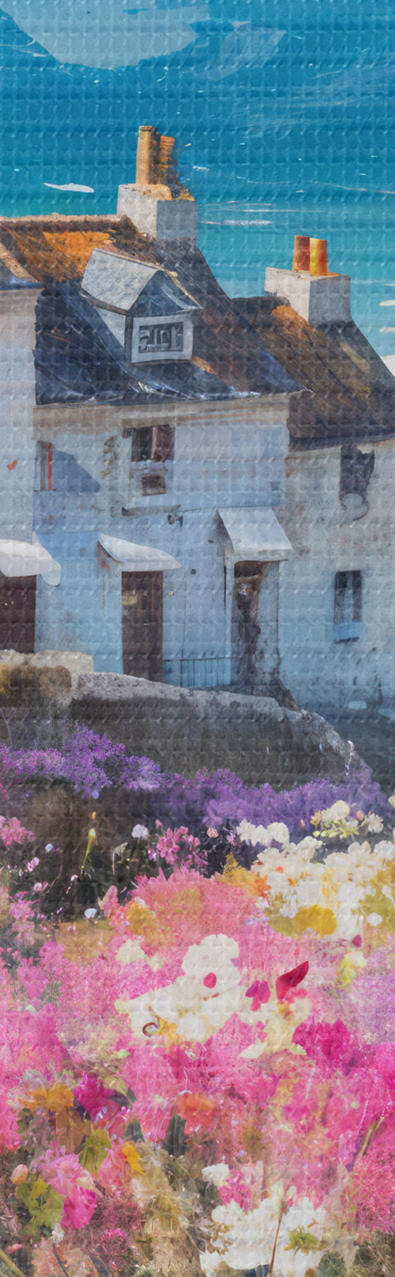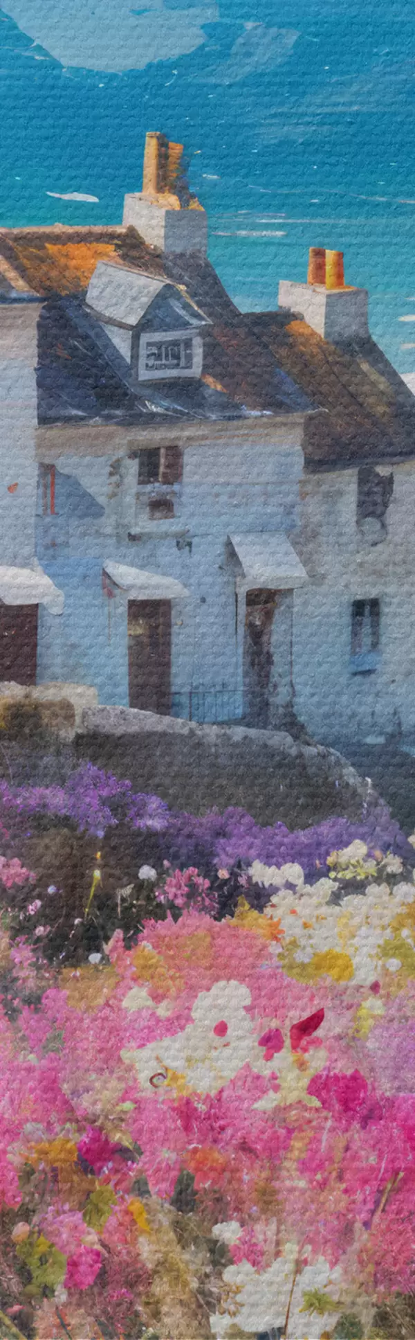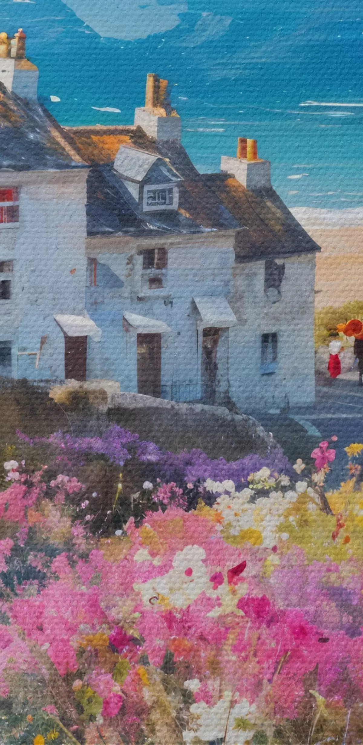 Pictură pe pânză O pictură în ulei colorat oraș de coastă cu case albe și o grădină de flori vibrante în prim-plan Nr s41090