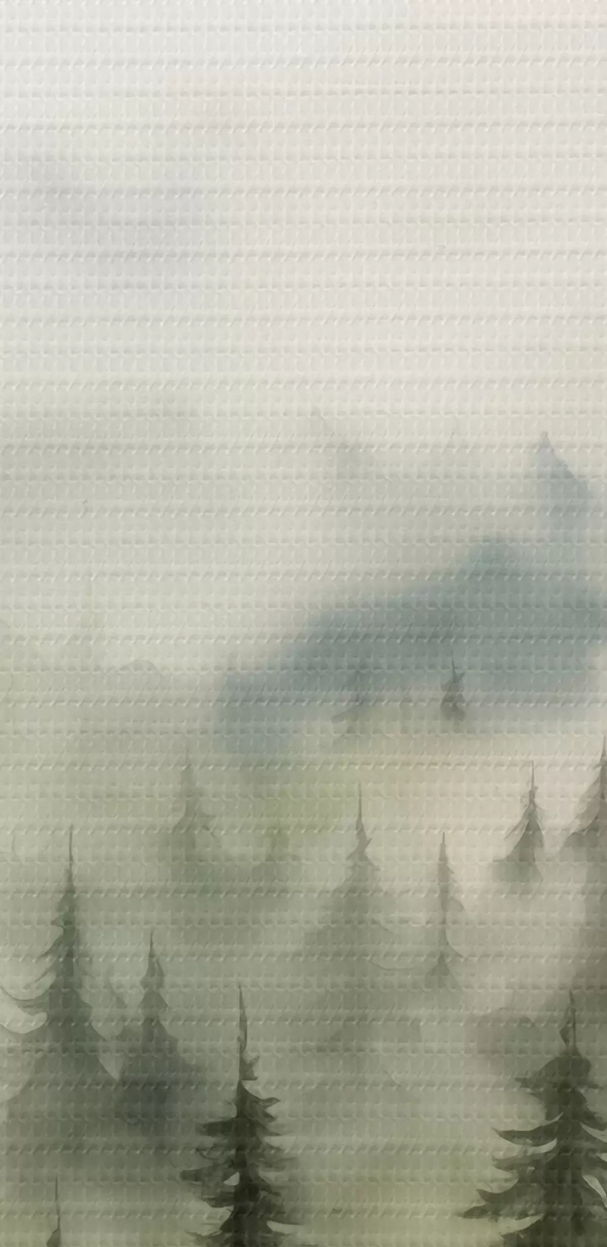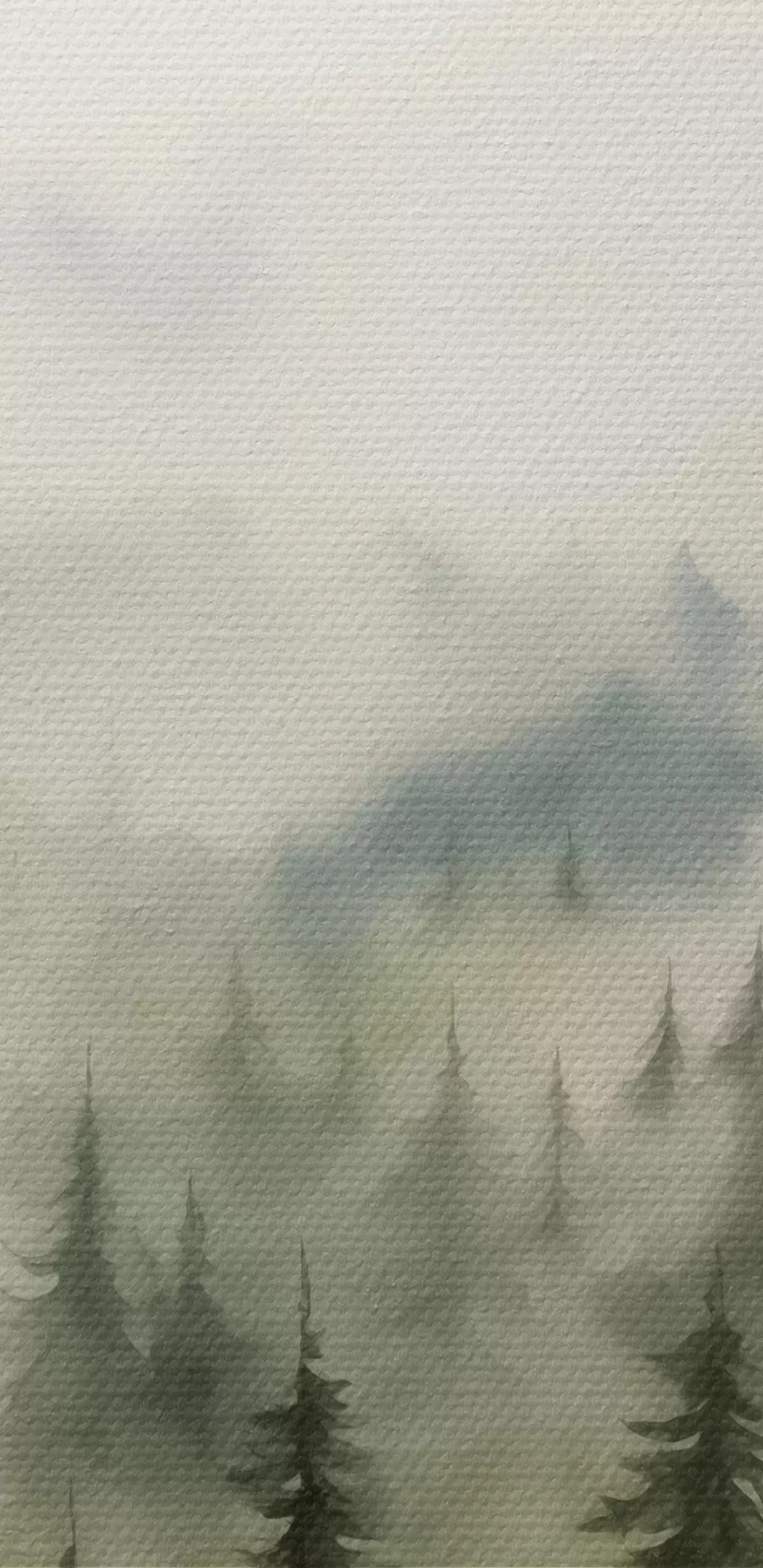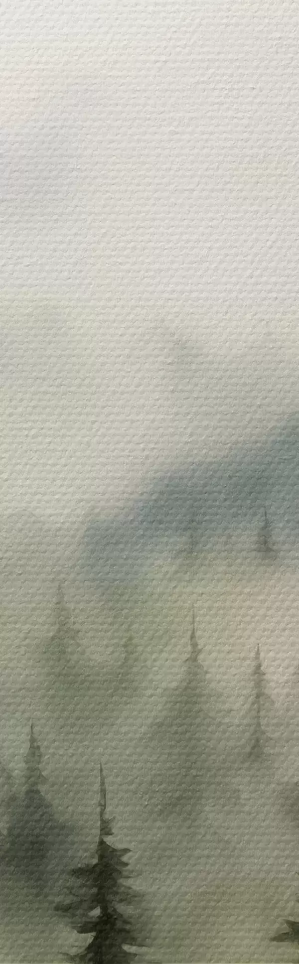 Pictură pe pânză Pădure verde pe fundal de munți munți și ceață acuarelă Nr s41241