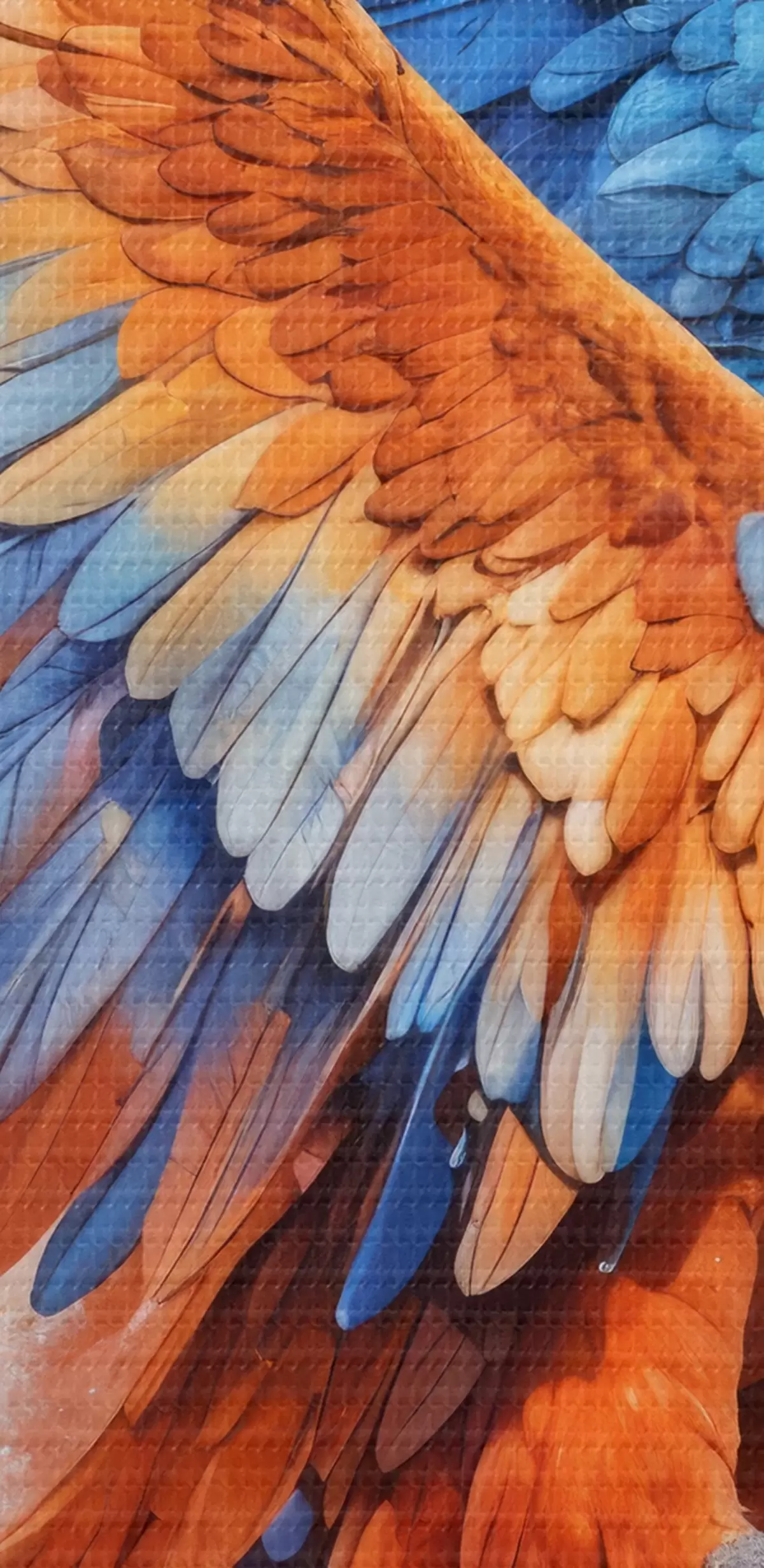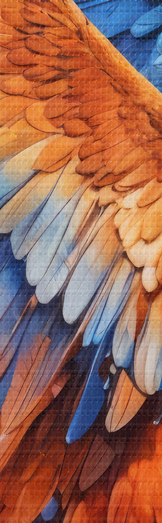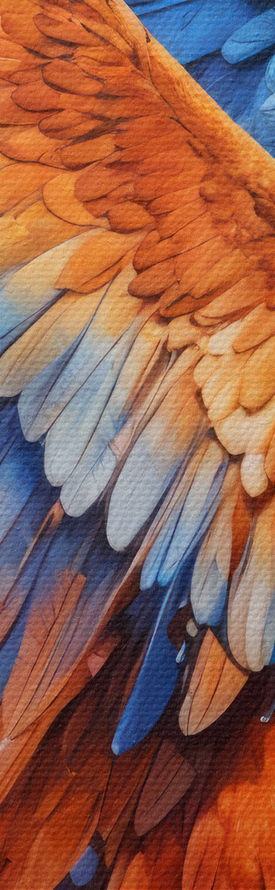 Pictură pe pânză Un papagal colorat cu pene vibrante albastru, portocaliu și galben în zbor pe un fundal stropit Nr s41250
