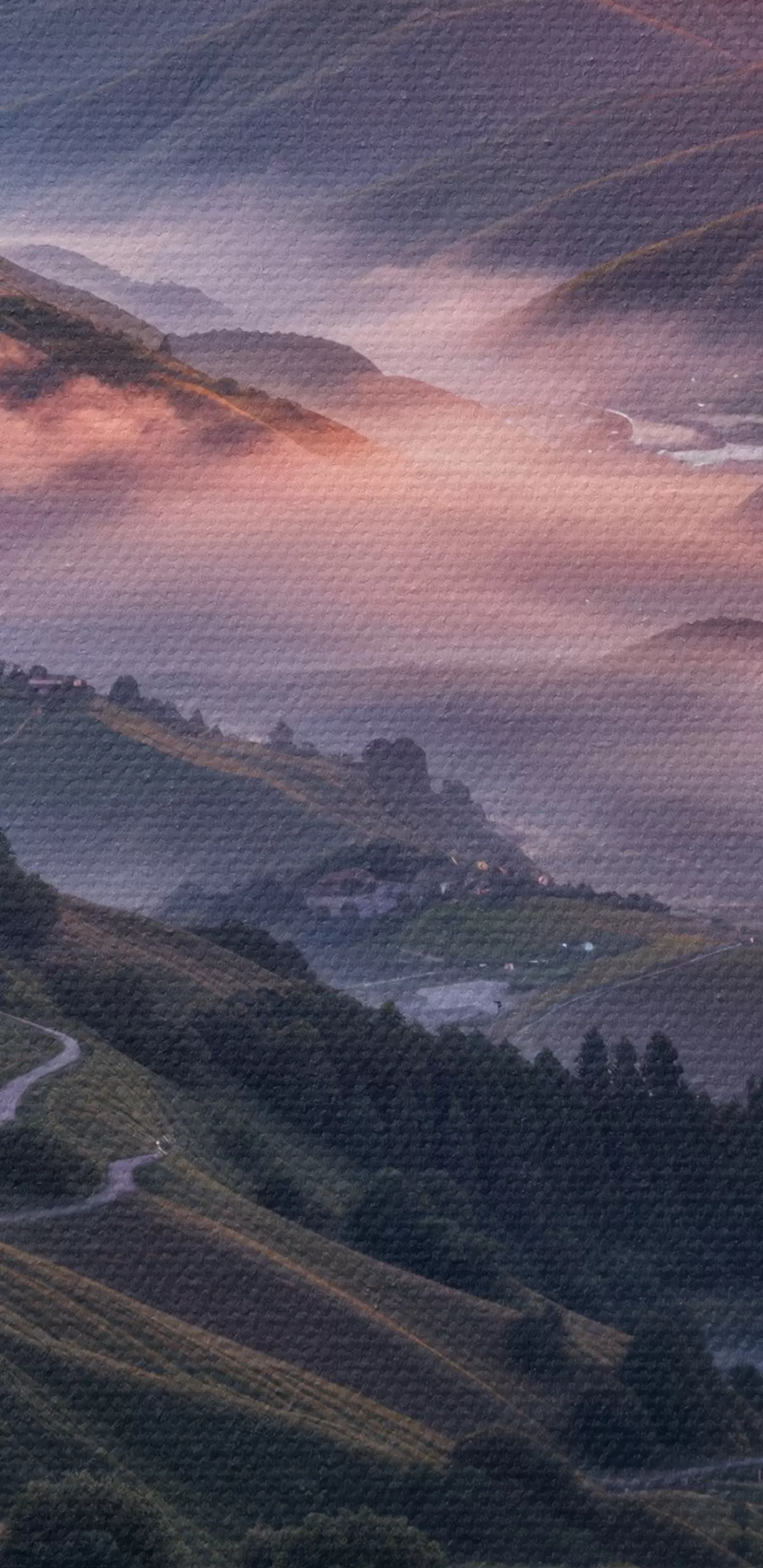 Pictură pe pânză Un peisaj uluitor cu un apus de soare vibrant peste o regiune muntoasă cu buchete de flori roz Nr s41263