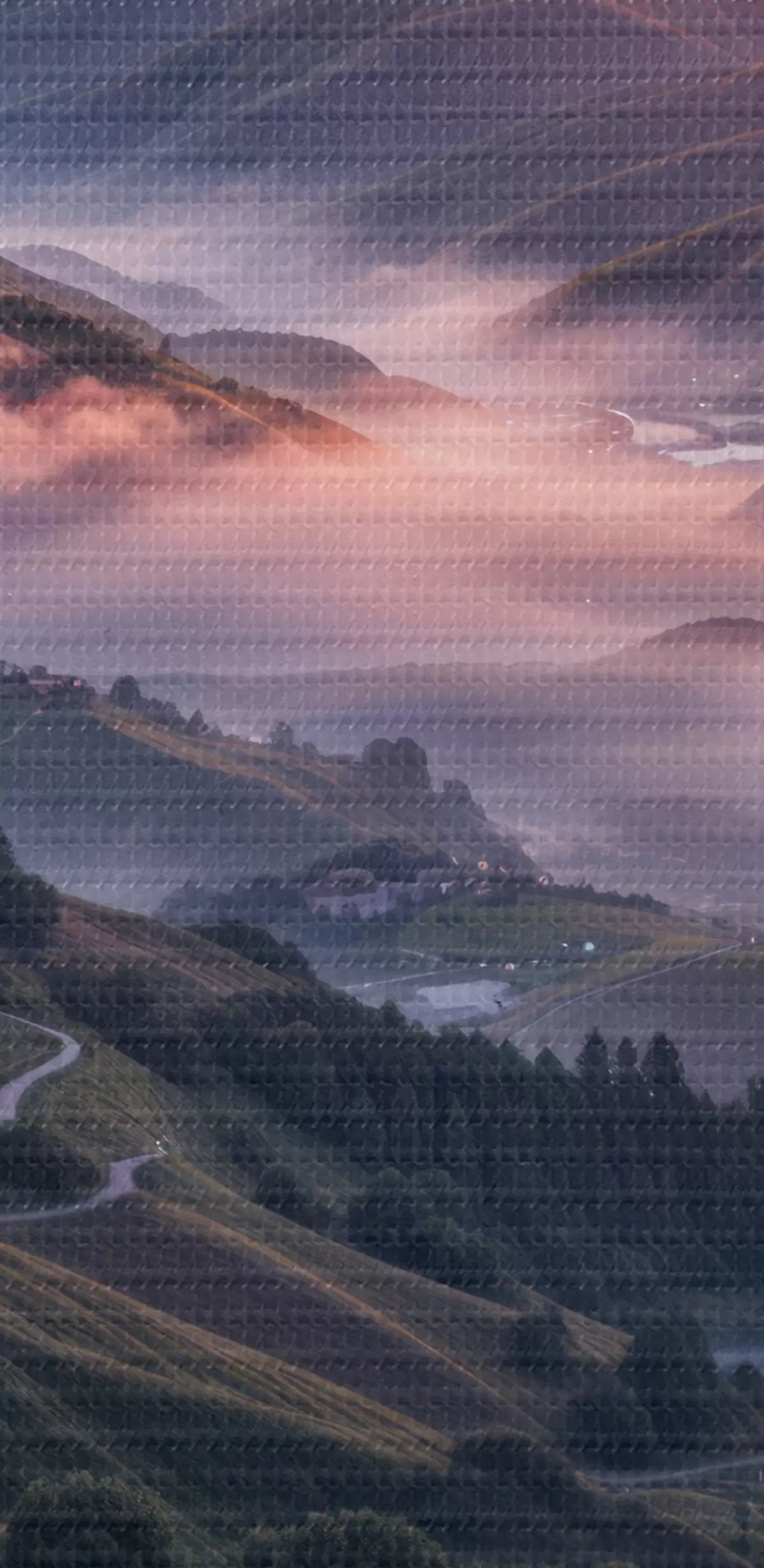 Tablouri Un peisaj uluitor cu un apus de soare vibrant peste o regiune muntoasă cu buchete de flori roz s41263