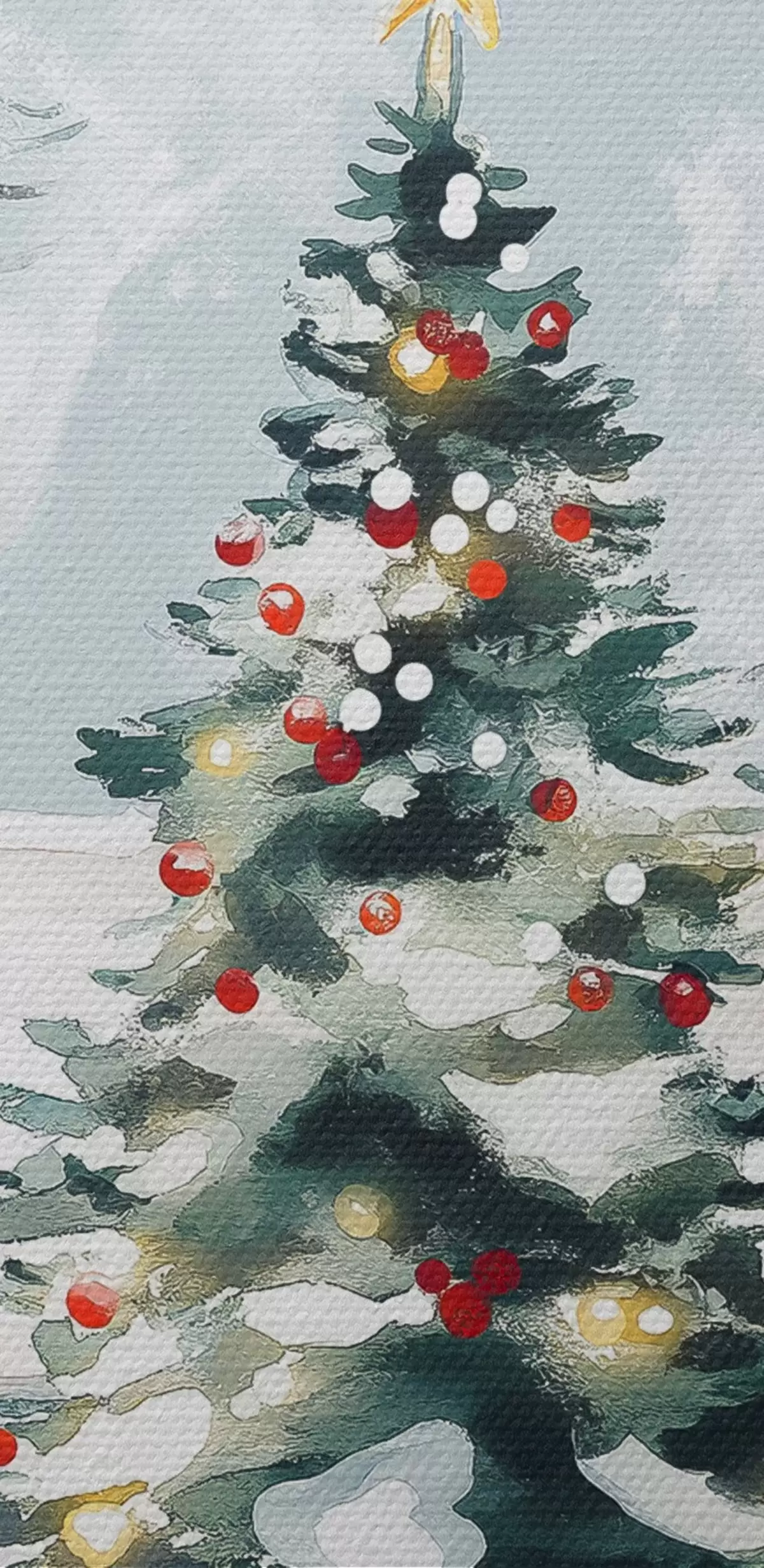 Pictură pe pânză Oraș de iarnă, brad decorat, Crăciun, acuarelă Nr s41364