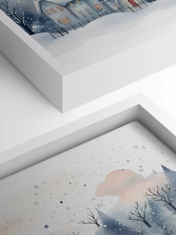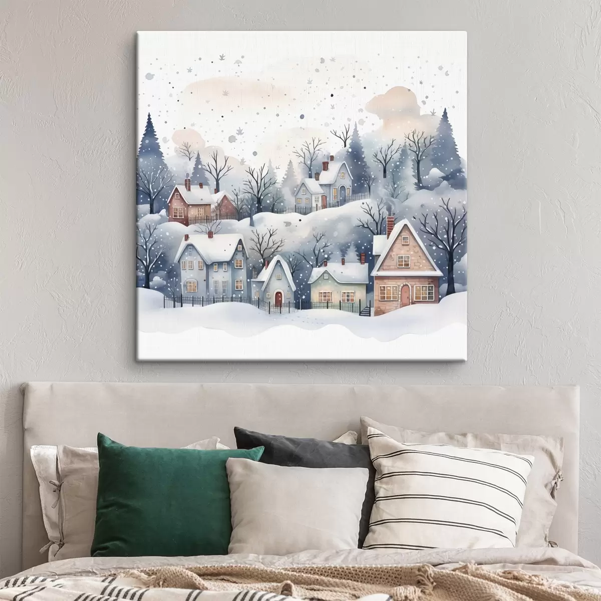 Pictură pe pânză Peisaj de iarnă acuarelă cu case și pădure de pini Nr s41389
