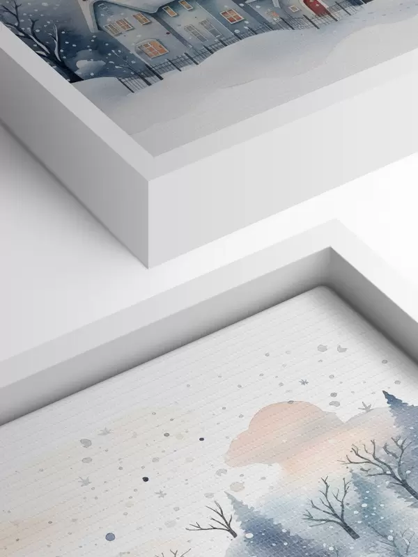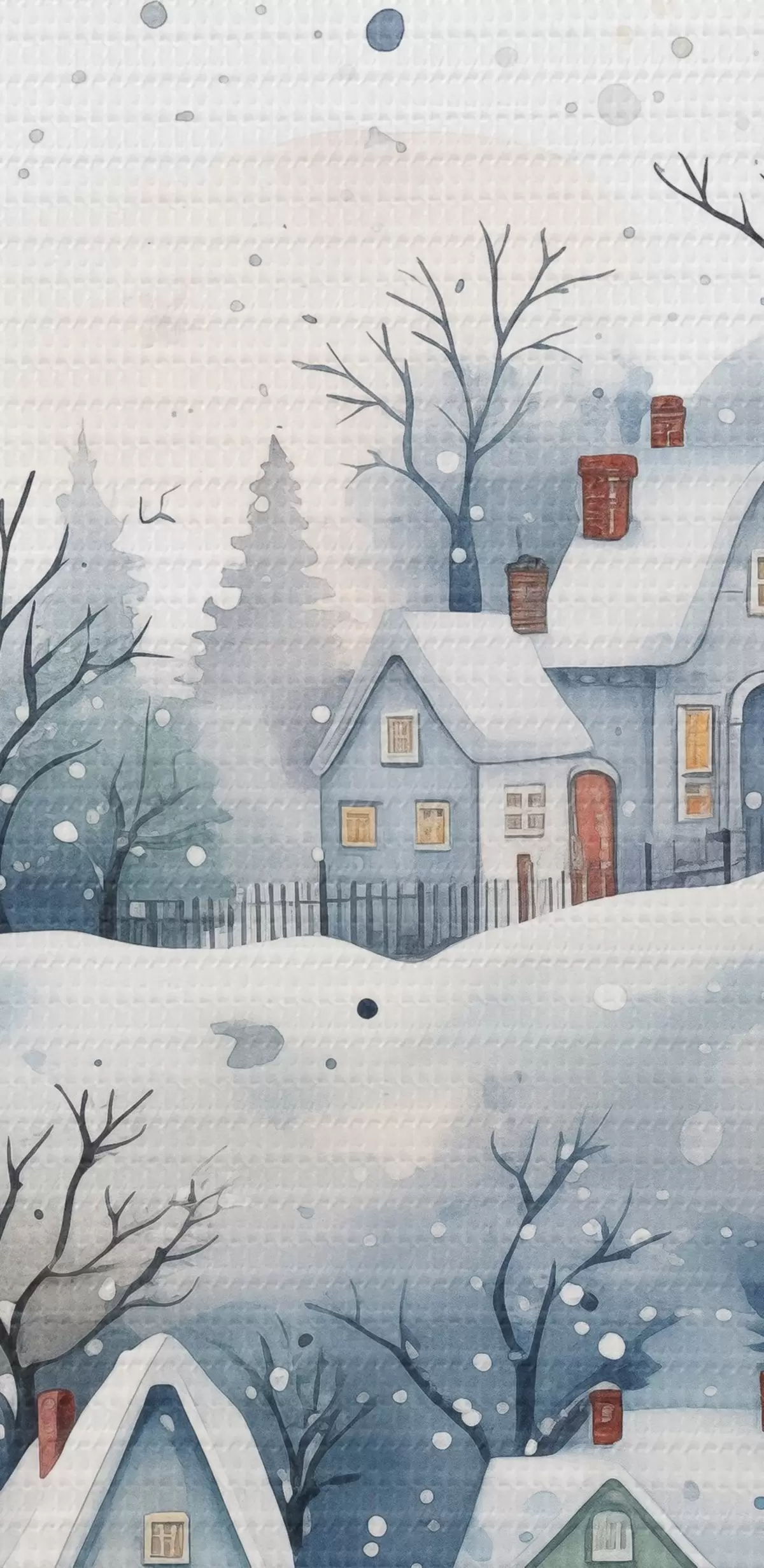 Tablouri Peisaj de iarnă acuarelă cu case și pădure de pini s41389