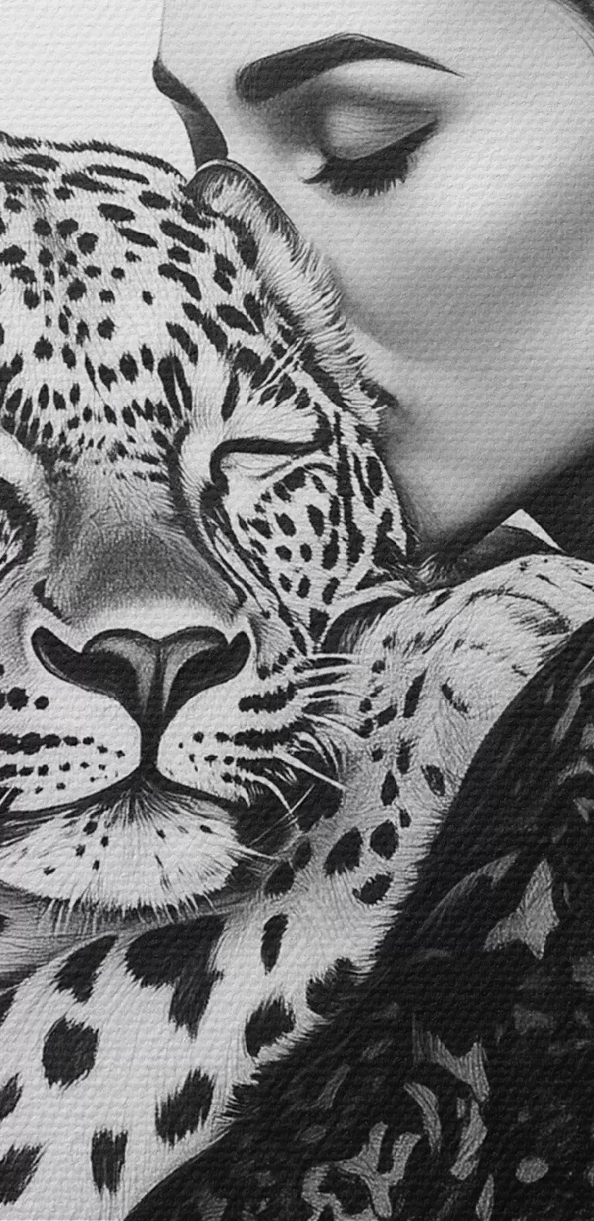 Pictură pe pânză Femeie sărutând leopard, desen în creion, animale sălbatice, alb-negru Nr s41457
