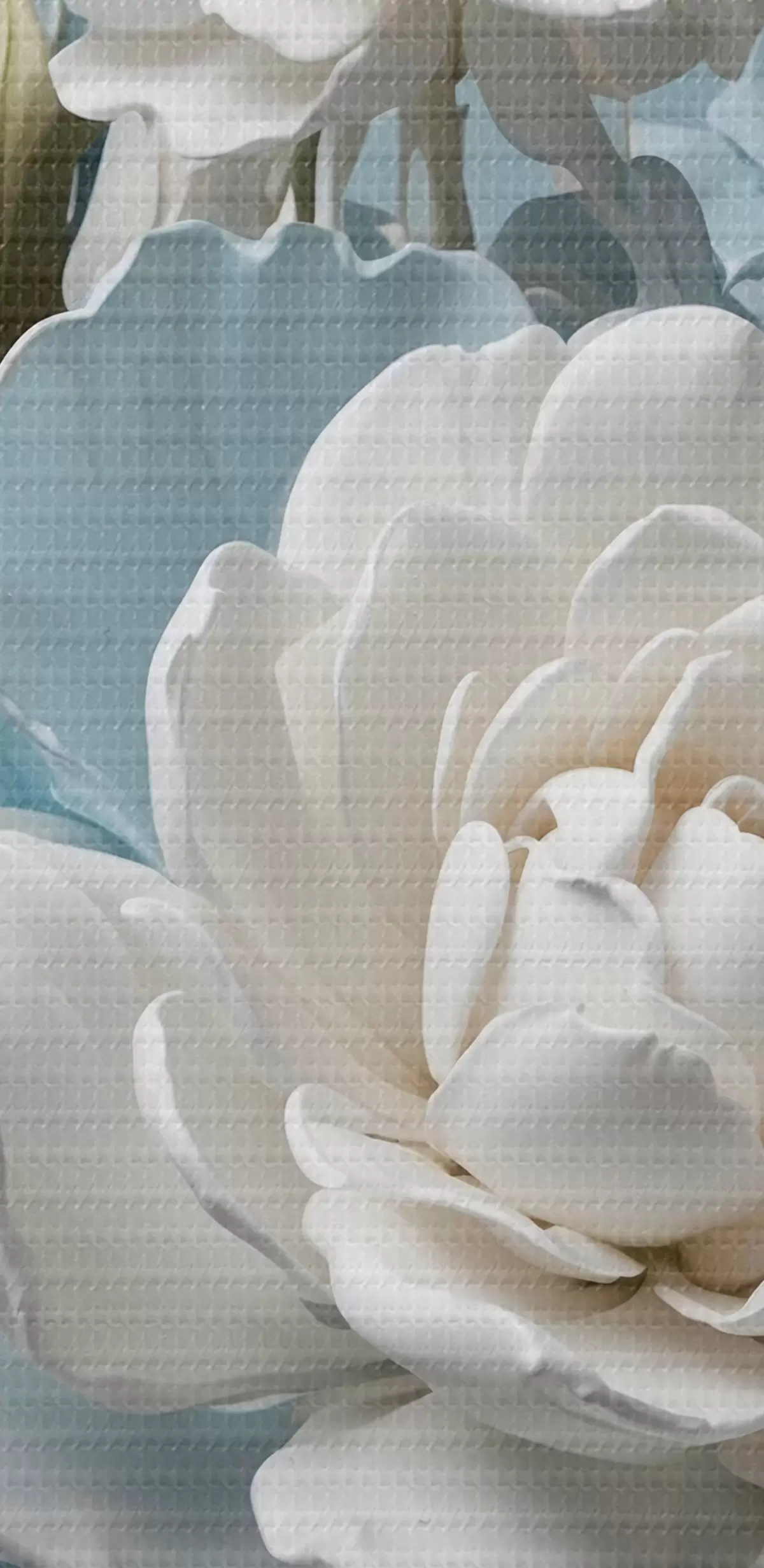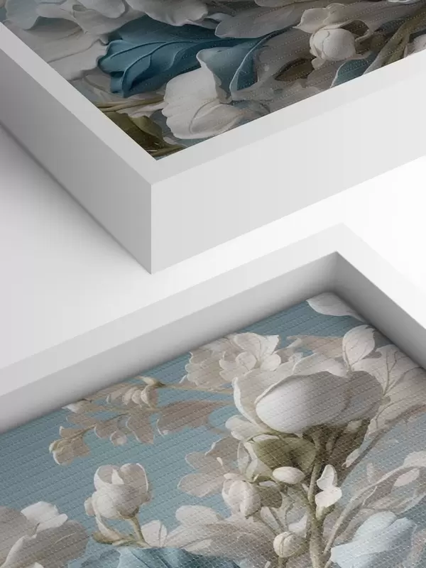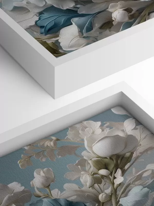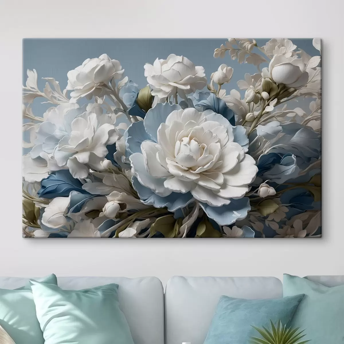 Pictură pe pânză Flori albe și frunze pe fundal albastru Nr s41527