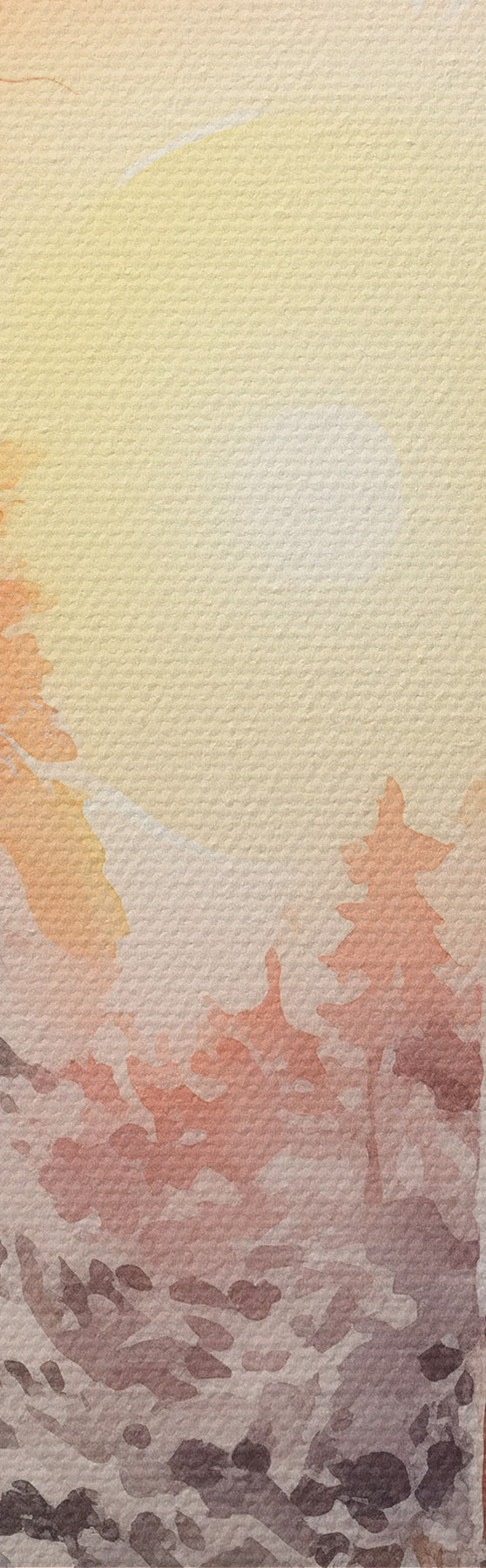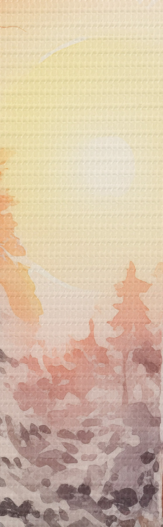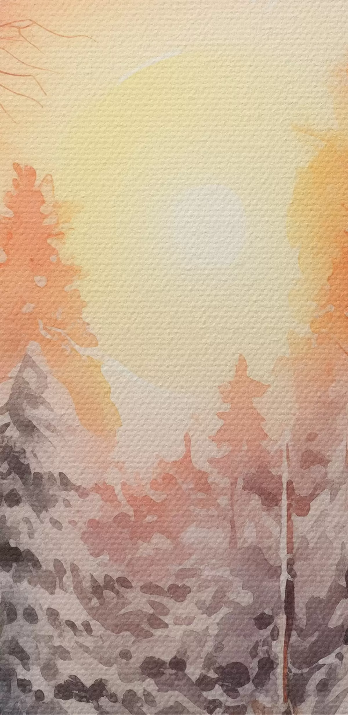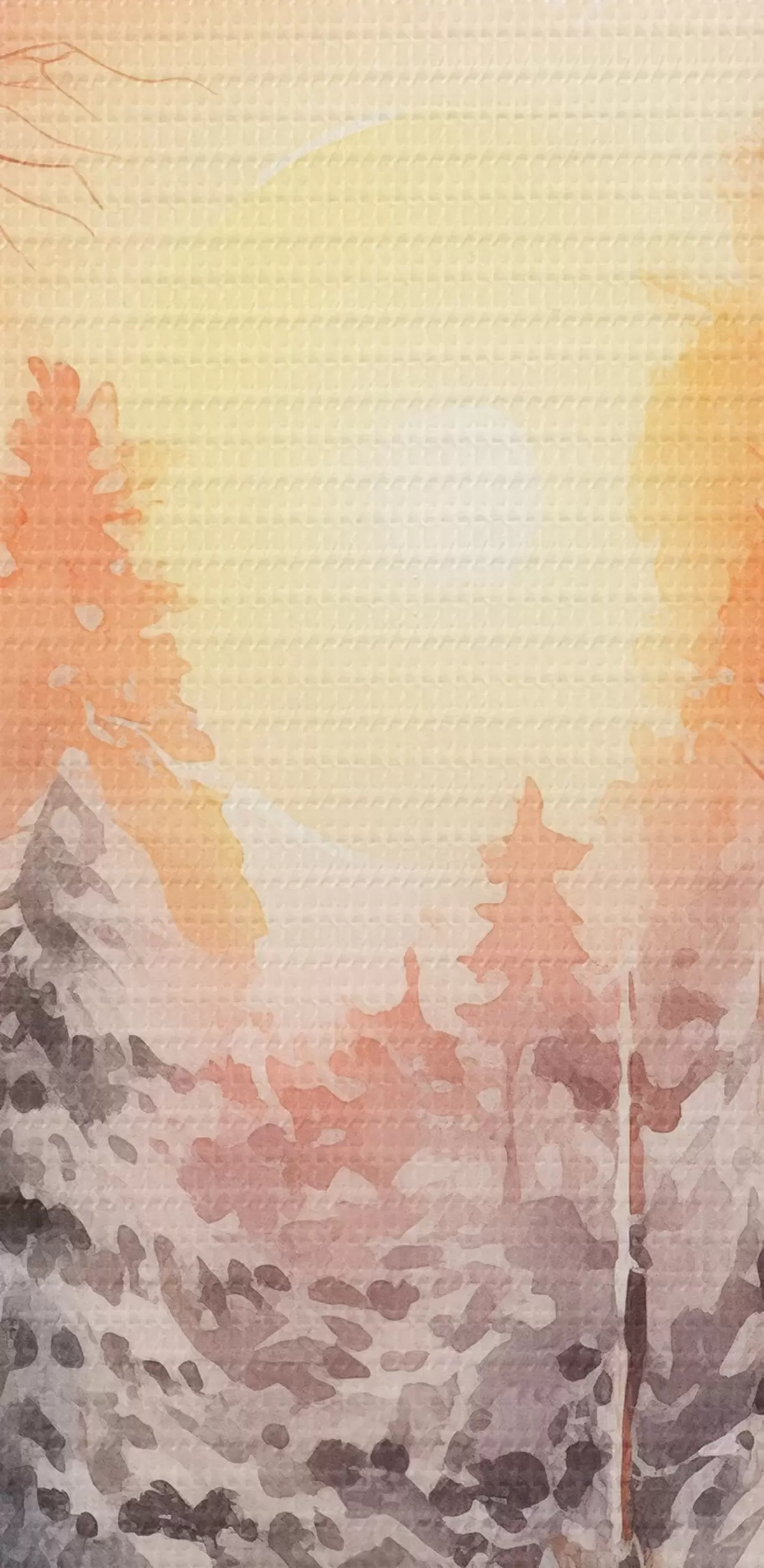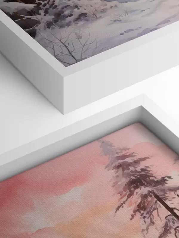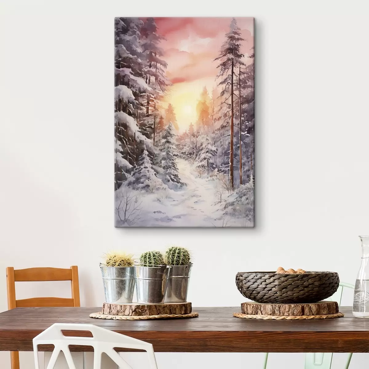 Tablouri Frumoasă iarnă, acuarelă pădure, zăpadă, copaci, cer roz, apus de soare s41641