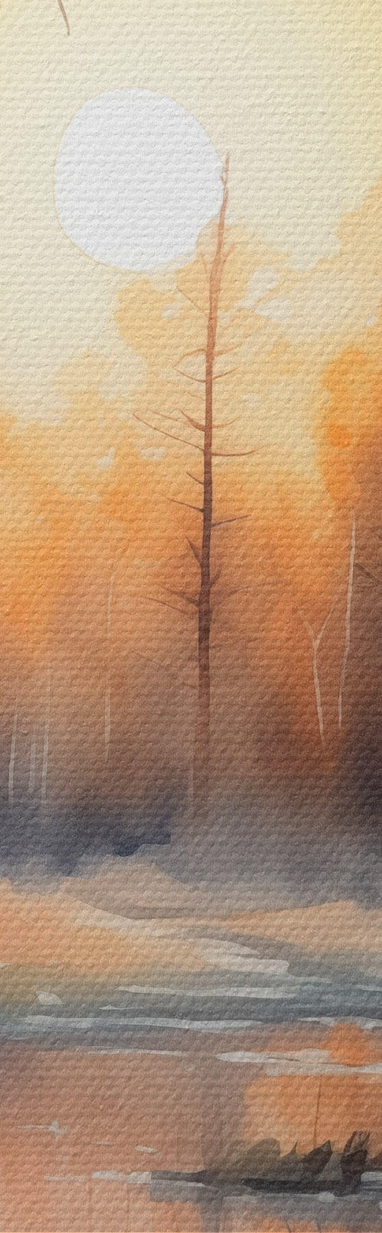 Tablouri Lac în pădure, acuarelă, culori de toamnă, ceață, cer apus de soare s41642