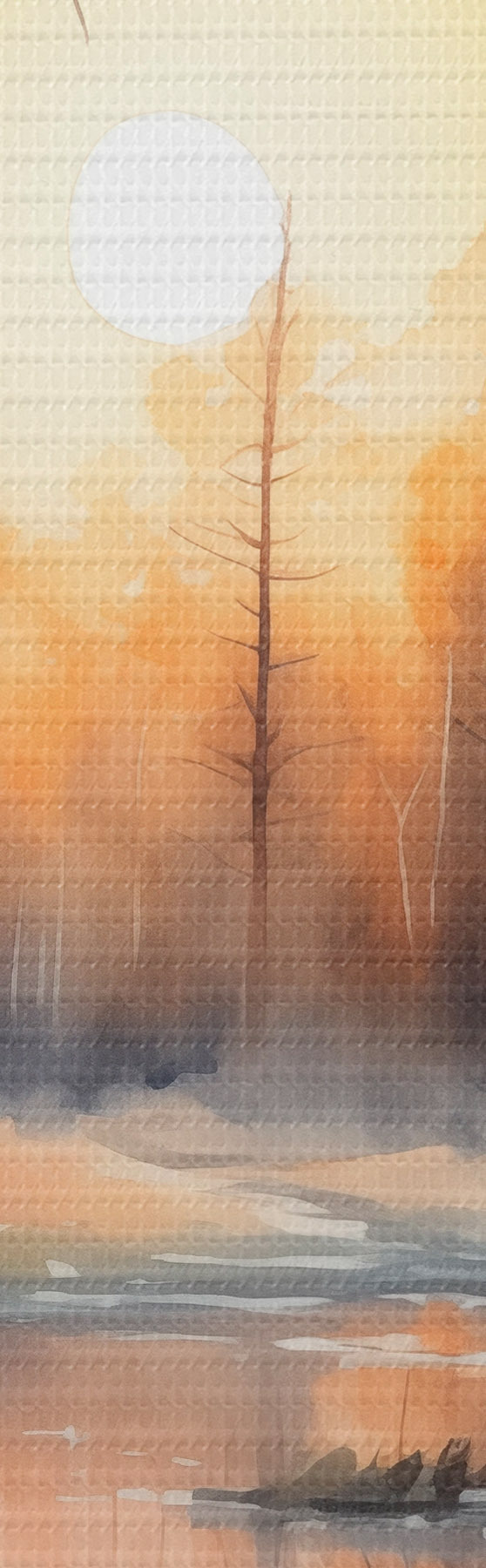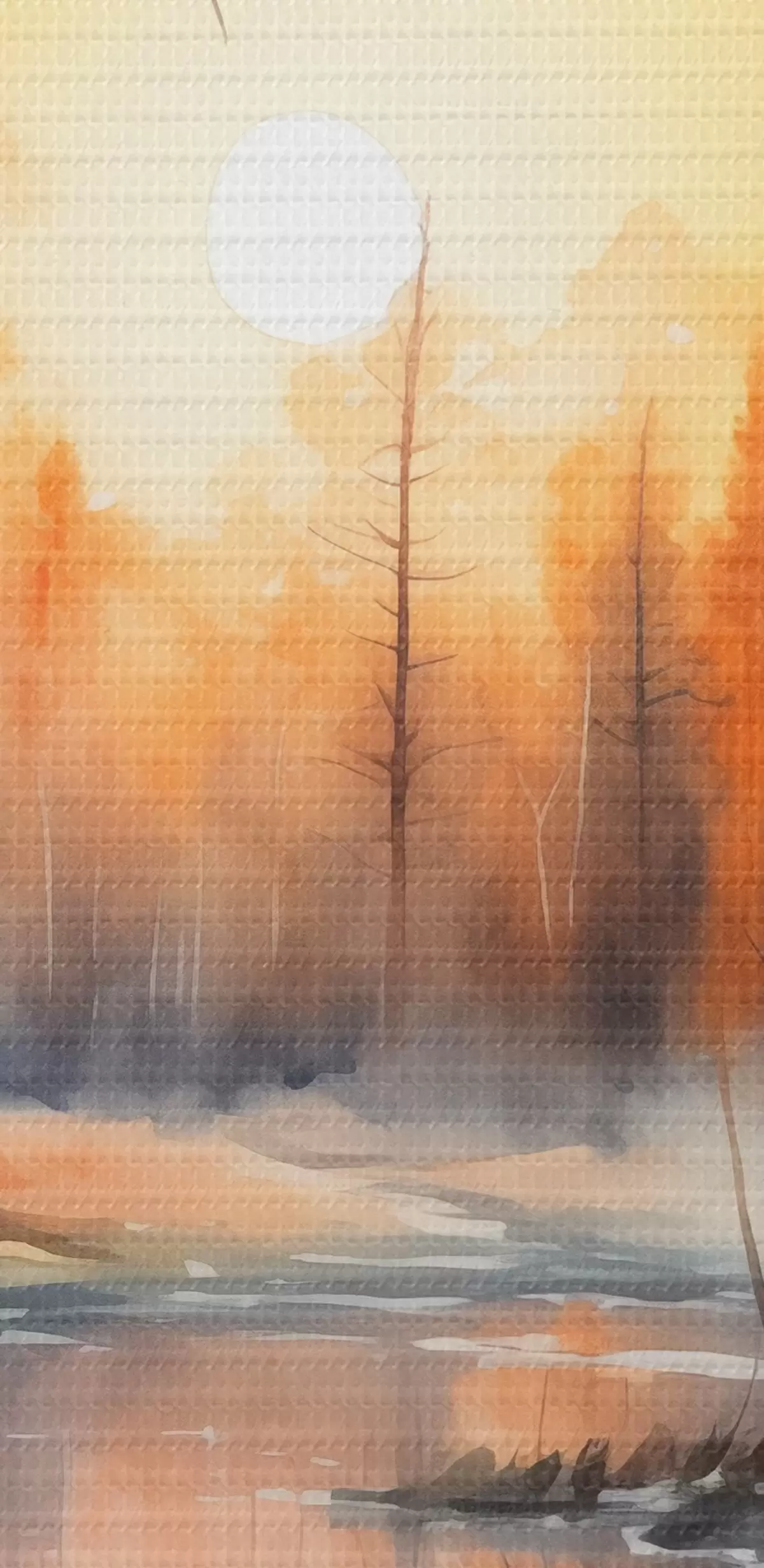 Pictură pe pânză Lac în pădure, acuarelă, culori de toamnă, ceață, cer apus de soare Nr s41642