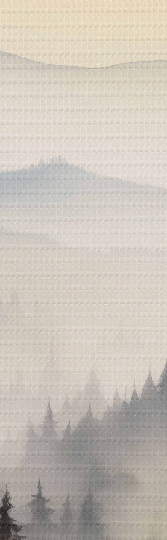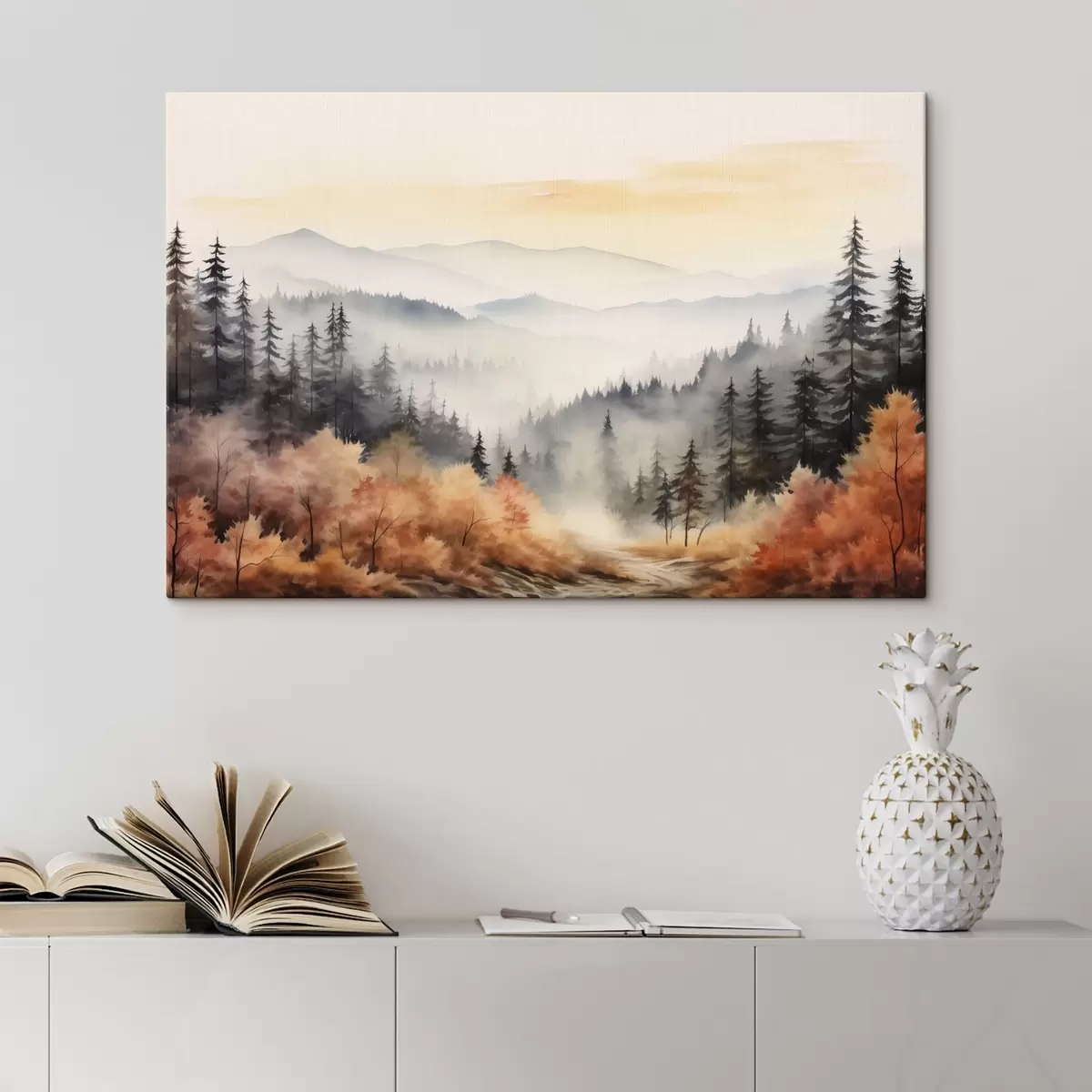 Pictură pe pânză Munți frumoși în ceață, pădure de toamnă, acuarelă Nr s41646