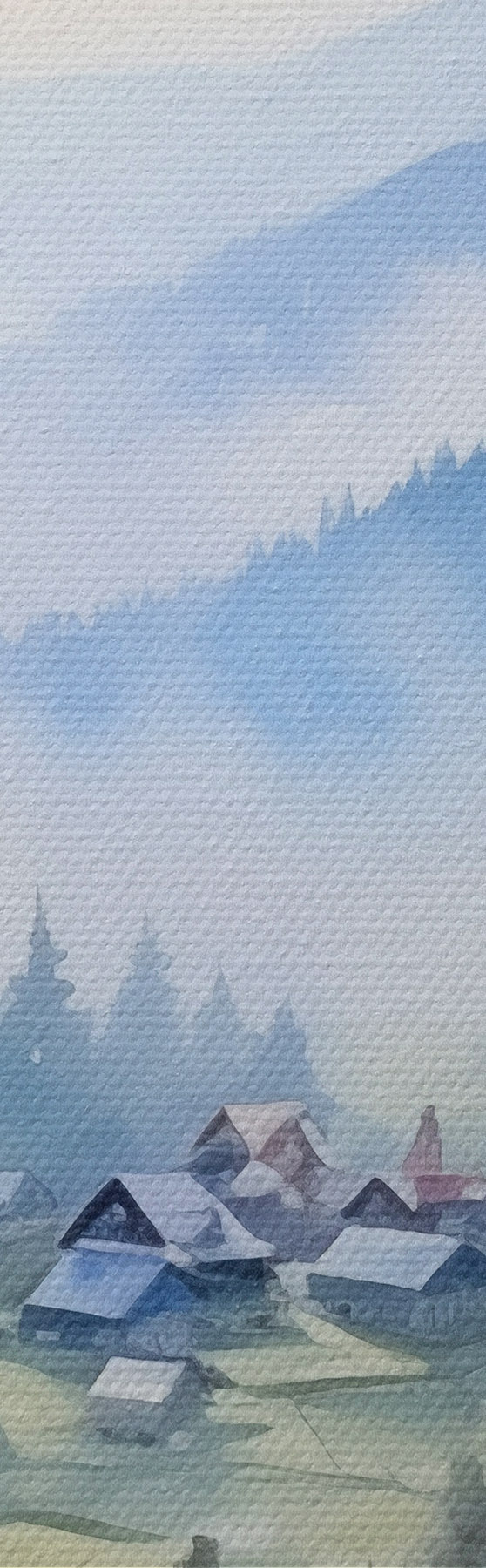 Tablouri Sat carpatic în munții cețoși, pădure, acuarelă s41648