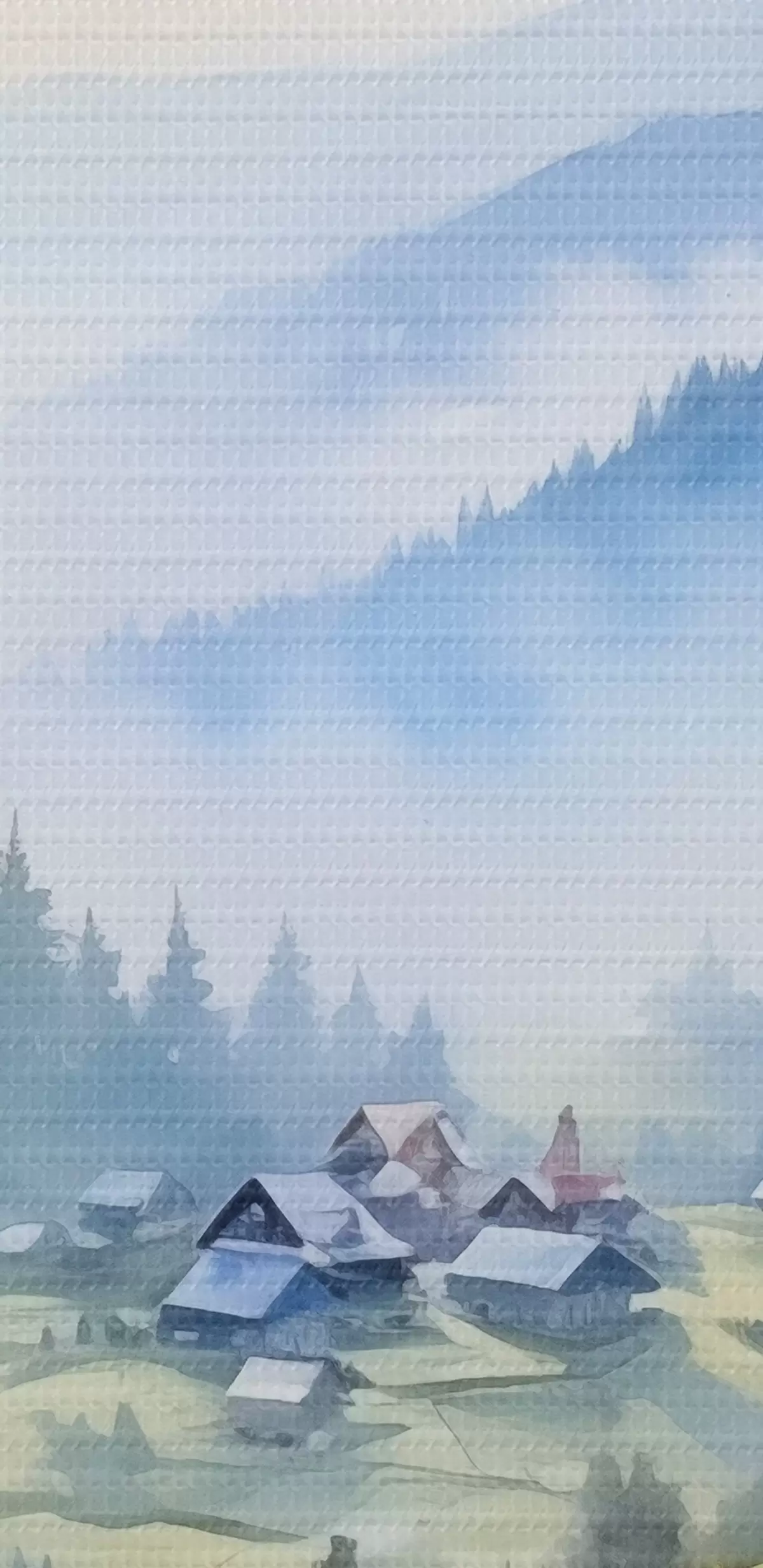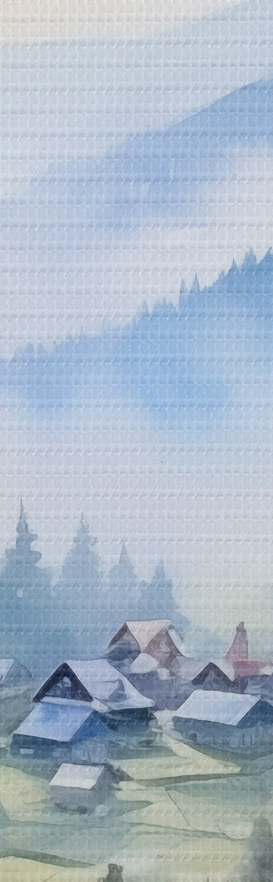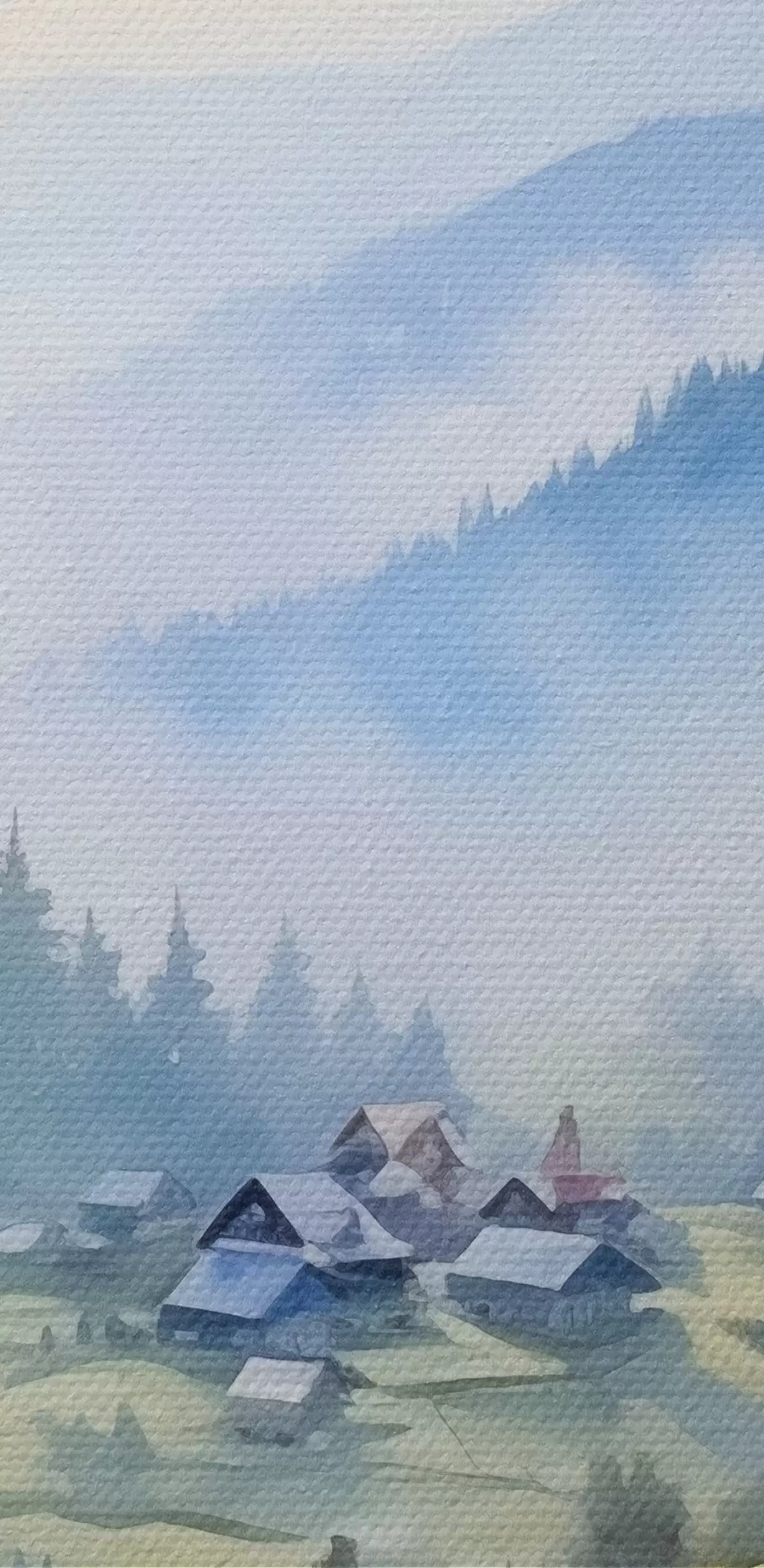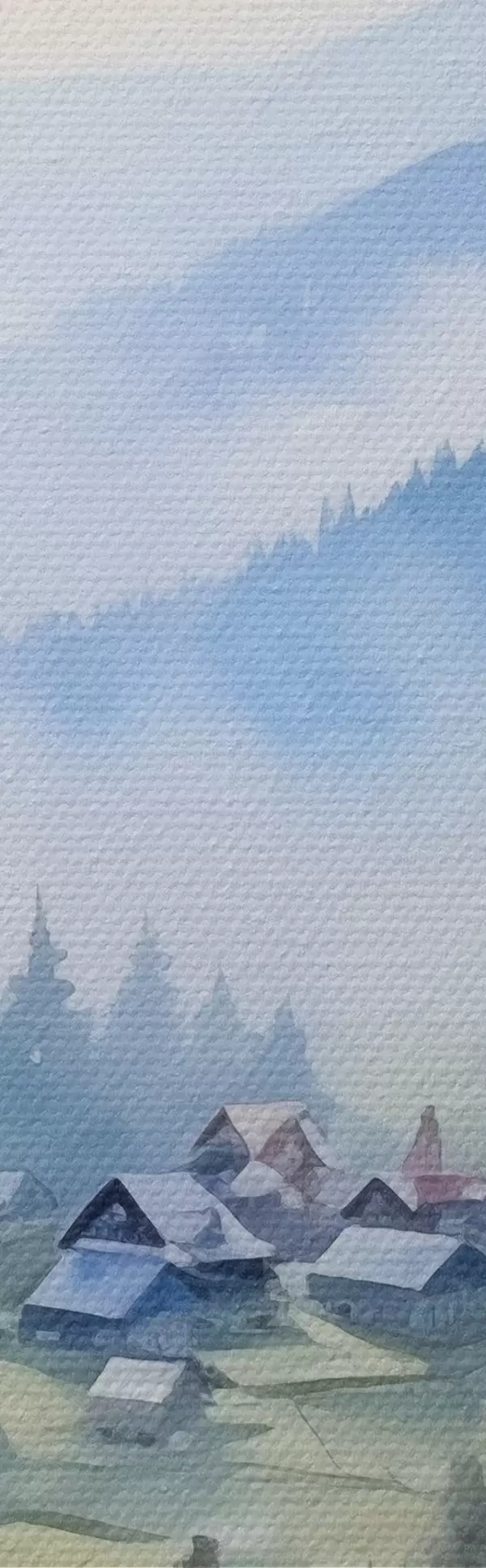 Pictură pe pânză Sat carpatic în munții cețoși, pădure, acuarelă Nr s41648