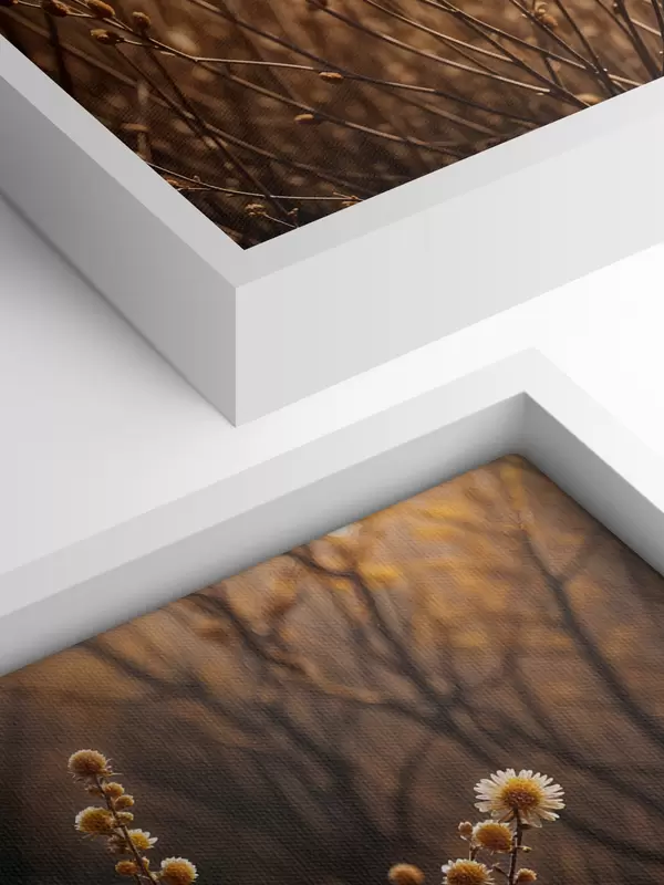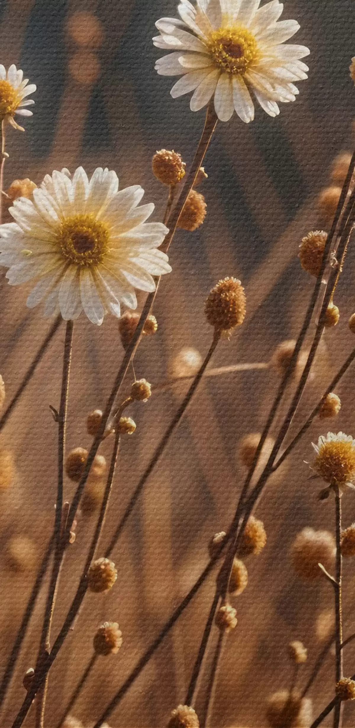 Pictură pe pânză Margarete albe într-un câmp de iarbă uscată și tulpini, cu lumina caldă a soarelui de seară Nr s41735