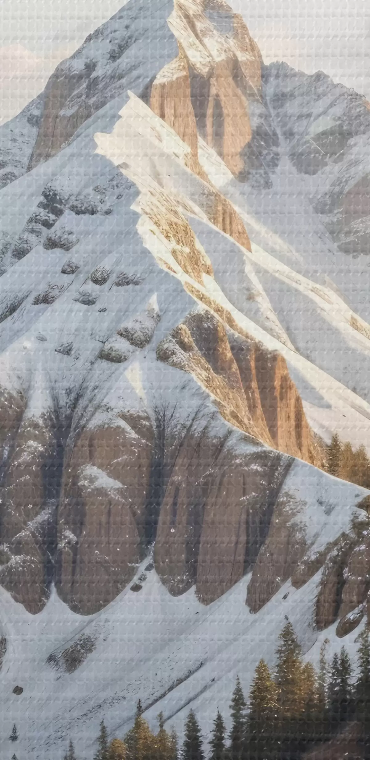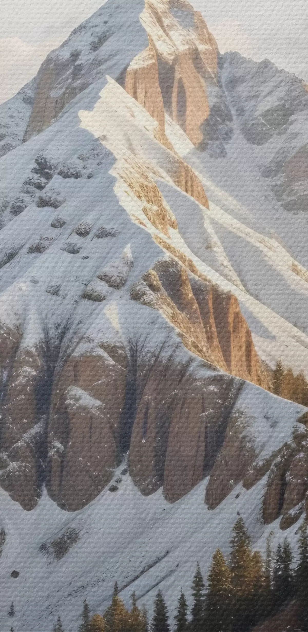 Pictură pe pânză Un vârf de munte acoperit de zăpadă se ridică deasupra unui peisaj împădurit, cu pini în prim-plan Nr s41736