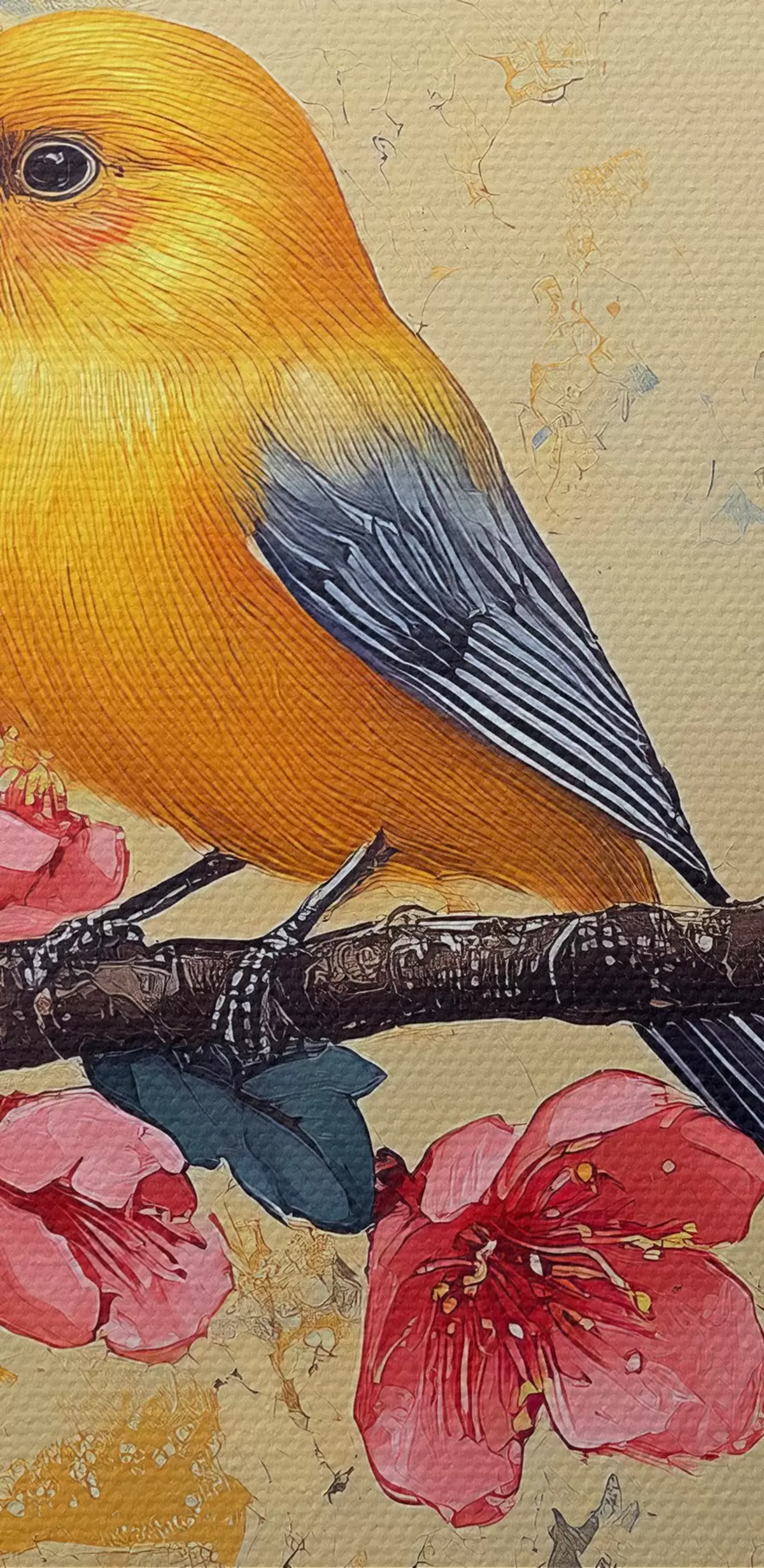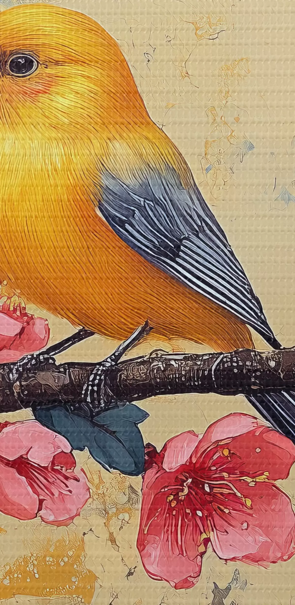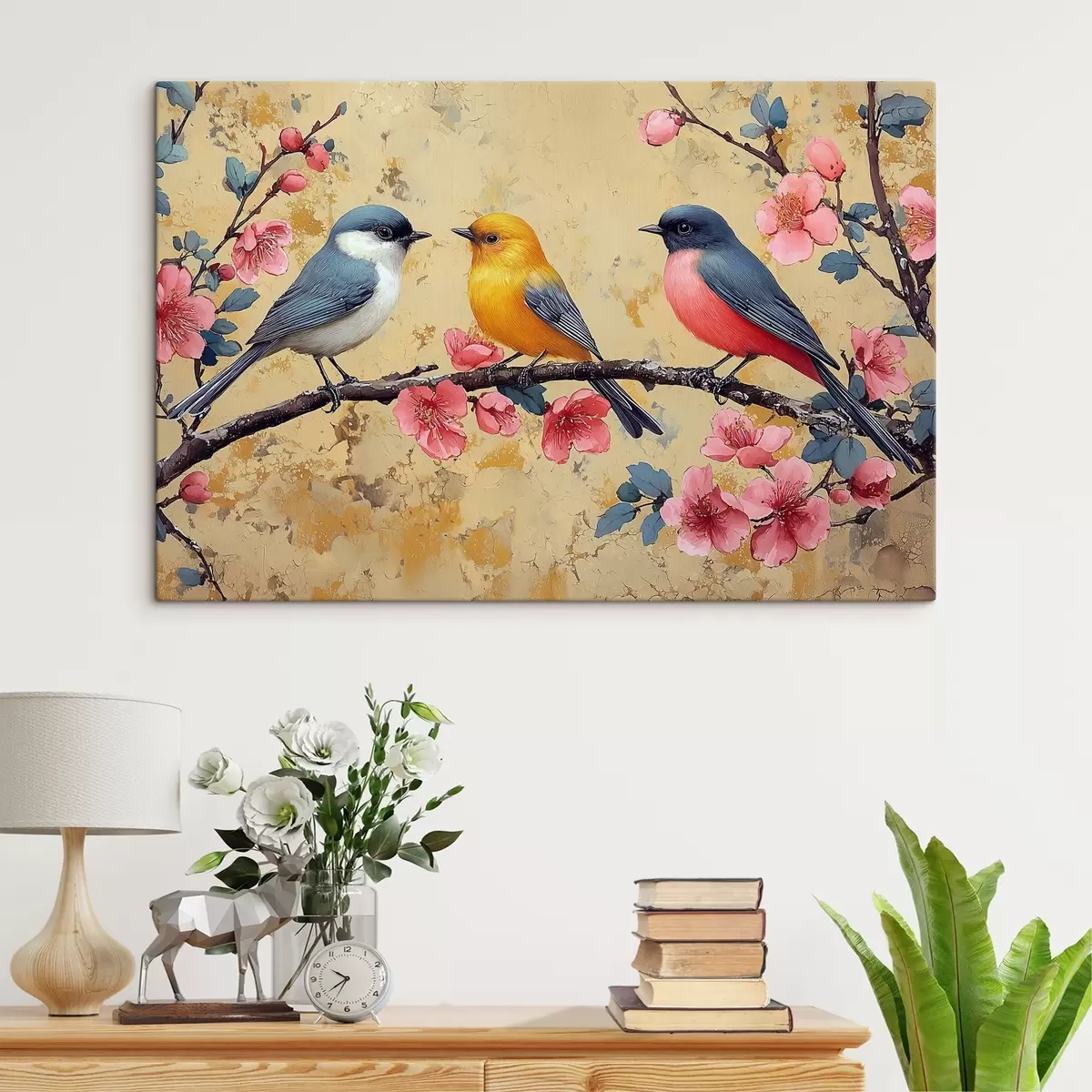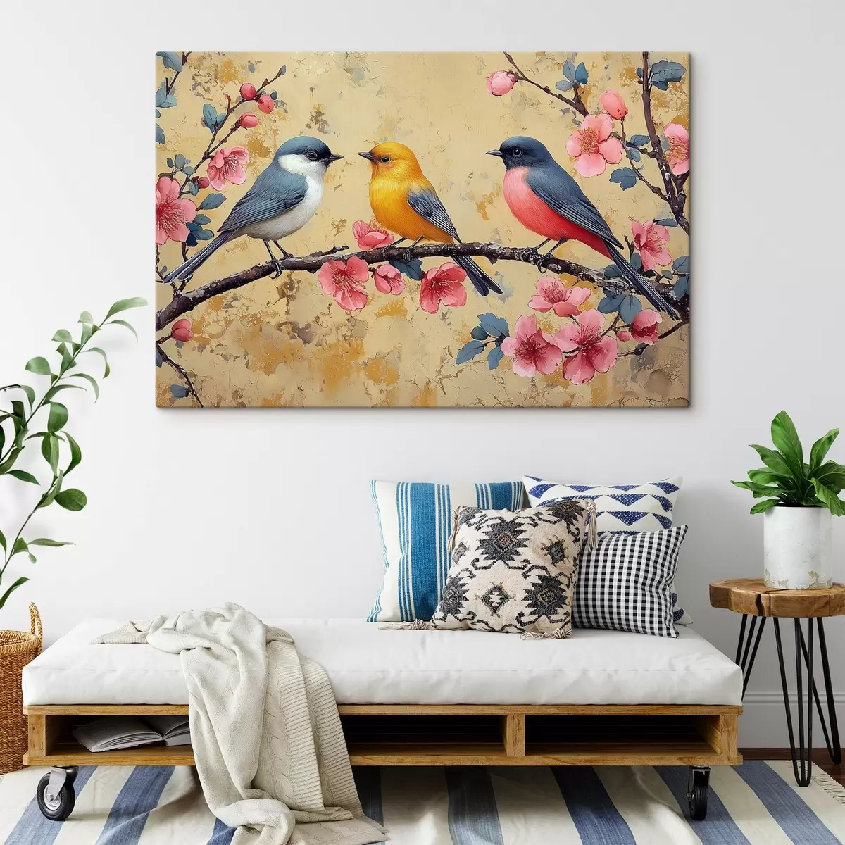 Pictură pe pânză Vrăbiuțe pe o ramură de sakura în stilul picturii în ulei Nr s41835