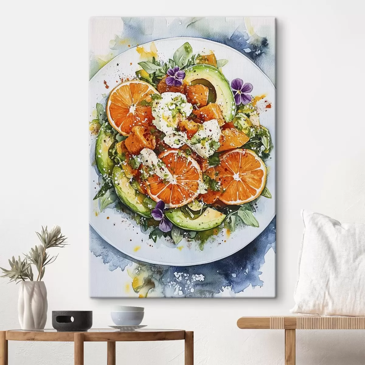 Pictură pe pânză Salată delicioasă cu portocale, brânză feta, dovlecei și avocado, alimente acuarelă Nr s41959