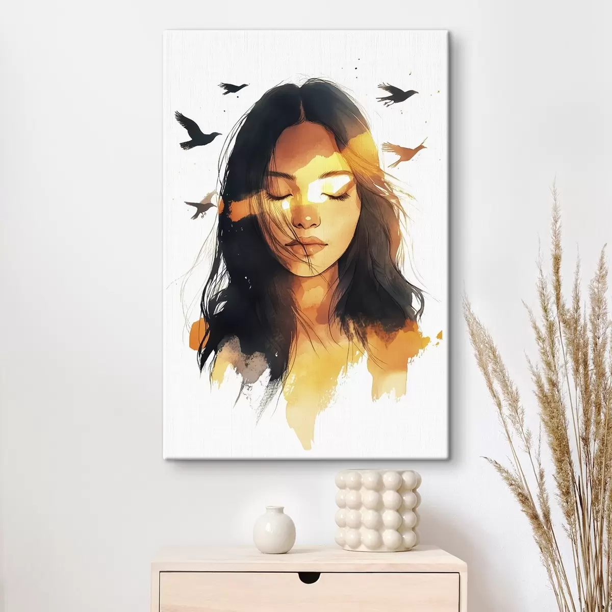 Pictură pe pânză Portret în stil acuarelă, fată frumoasă, lumina soarelui, păsări zburătoare Nr s42198