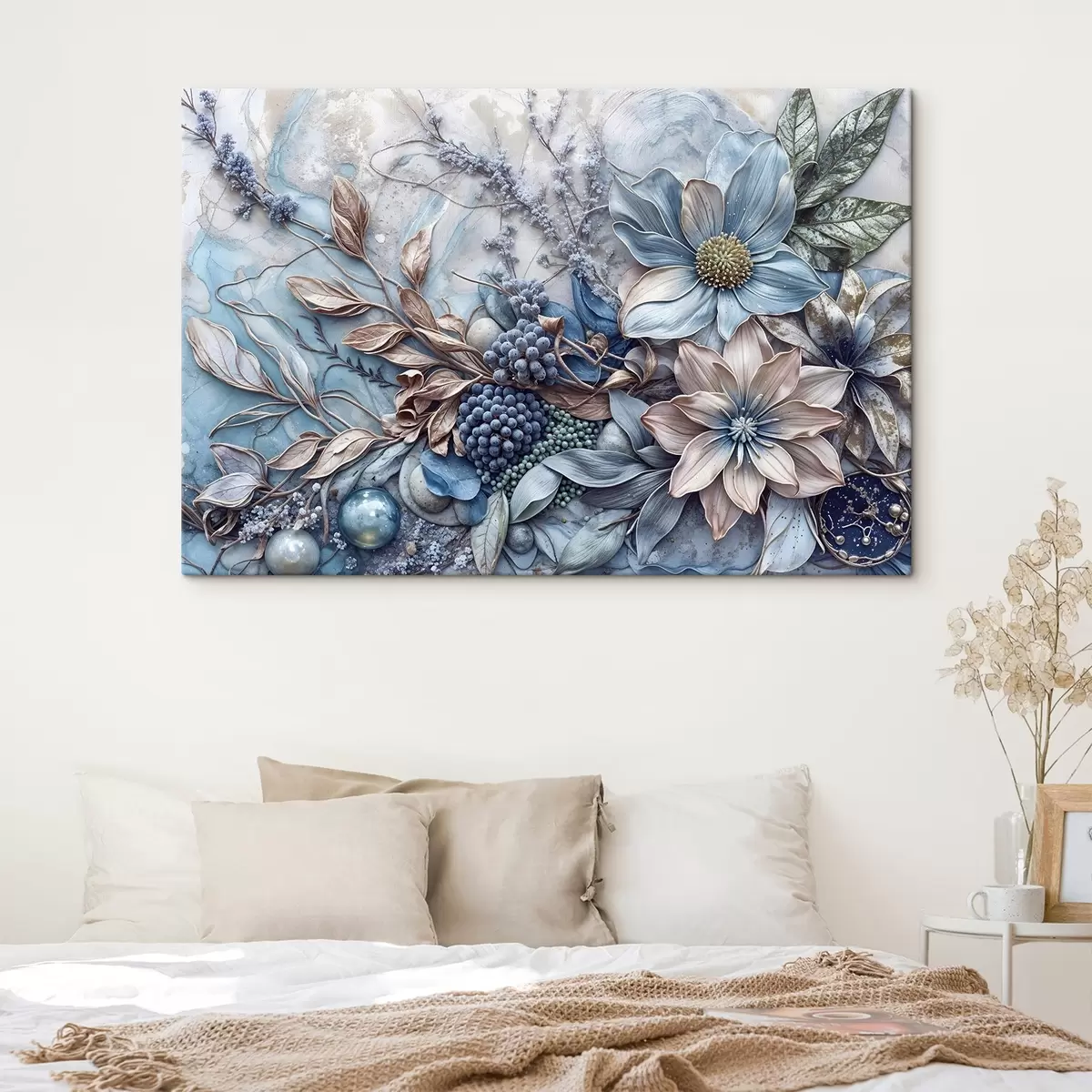 Pictură pe pânză O textură detaliată abstractă cu flori luxuriante, cu flori mari, vibrante, albastre și roz, fructe de pădure și alte elemente botanice Nr s42210