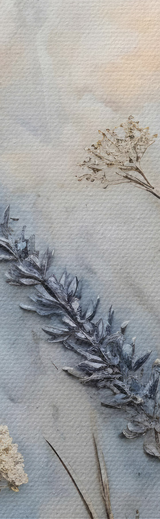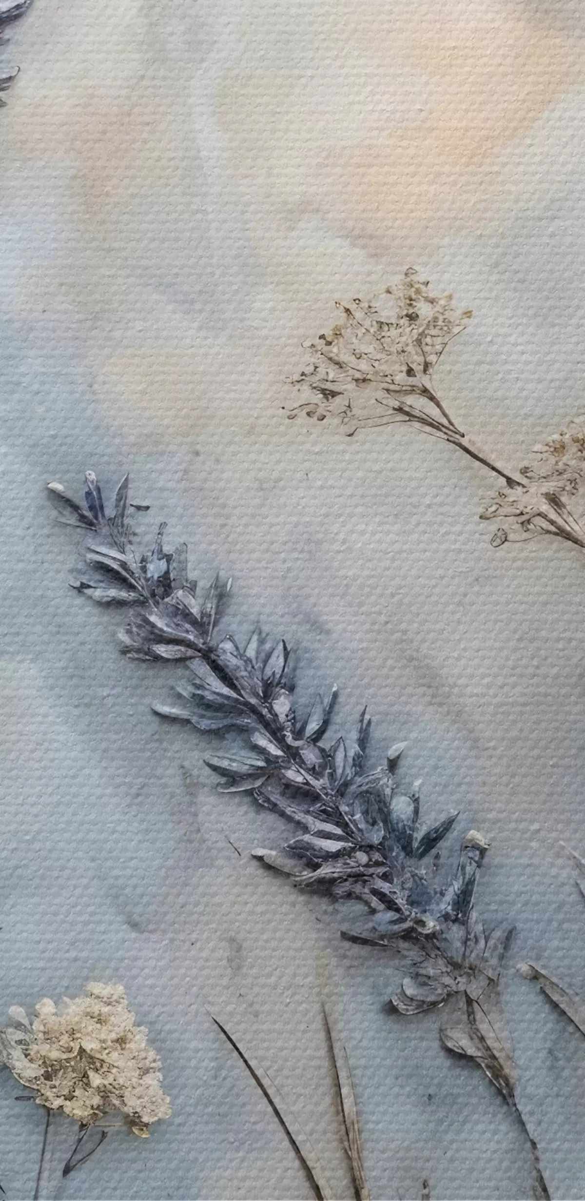 Tablouri Un câmp de diverse flori sălbatice și plante în nuanțe de albastru, alb și bej pe un fundal moale, cețos s42214