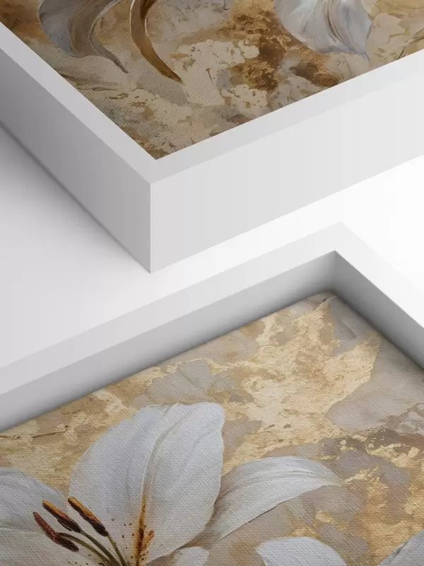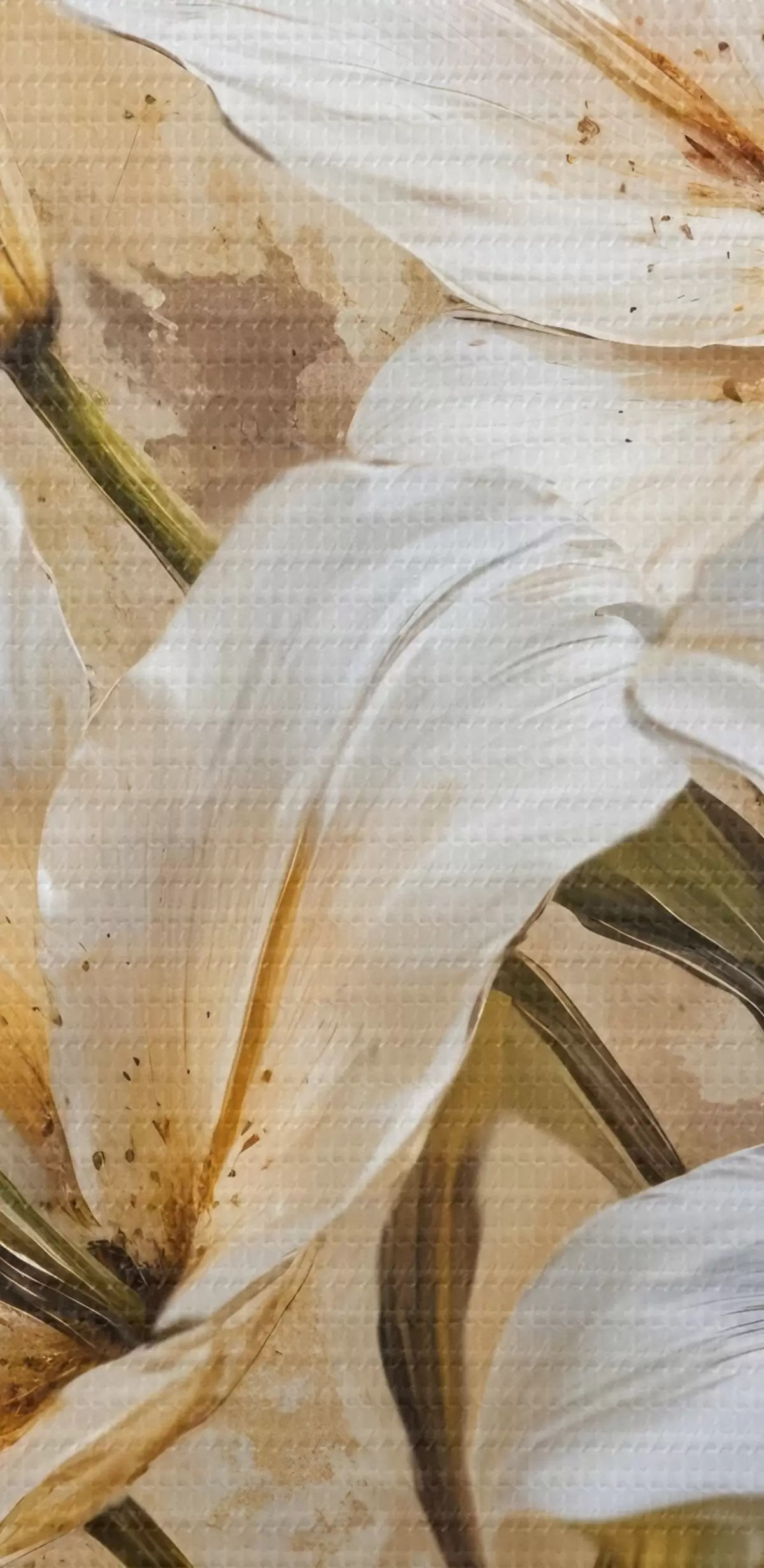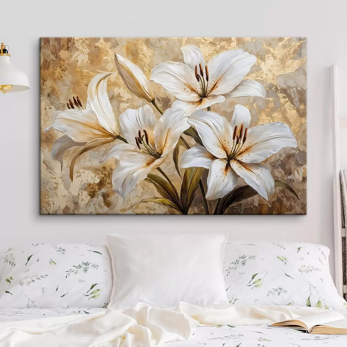 Pictură pe pânză Crini albi cu centre galbene pe un fundal bej texturat Nr s42216