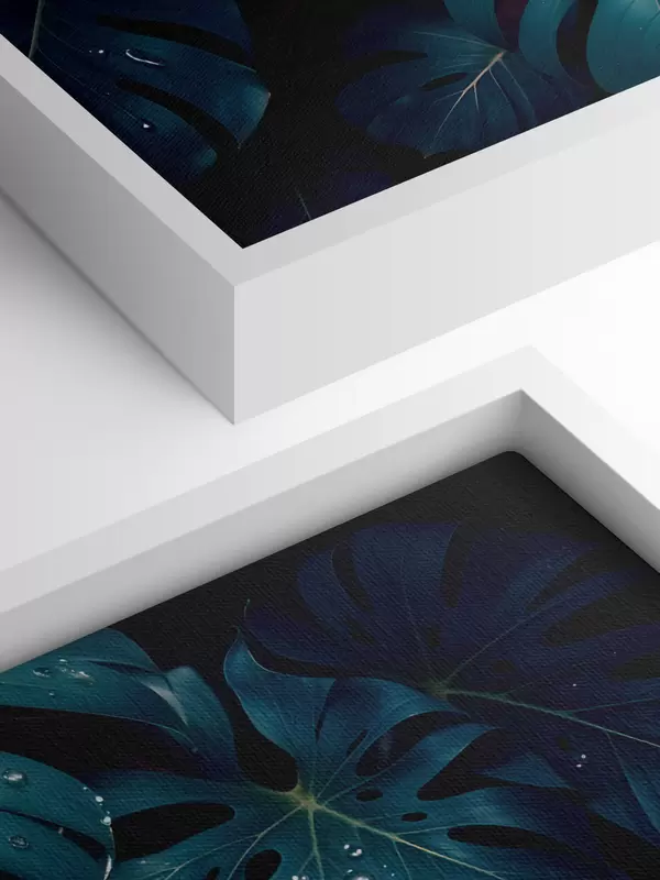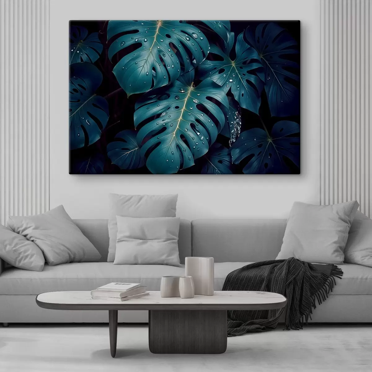 Pictură pe pânză Frunze luxuriante de monstera tropicală cu picături de apă pe un fundal întunecat, creând o imprimare atmosferică și mohorâtă Nr s42233