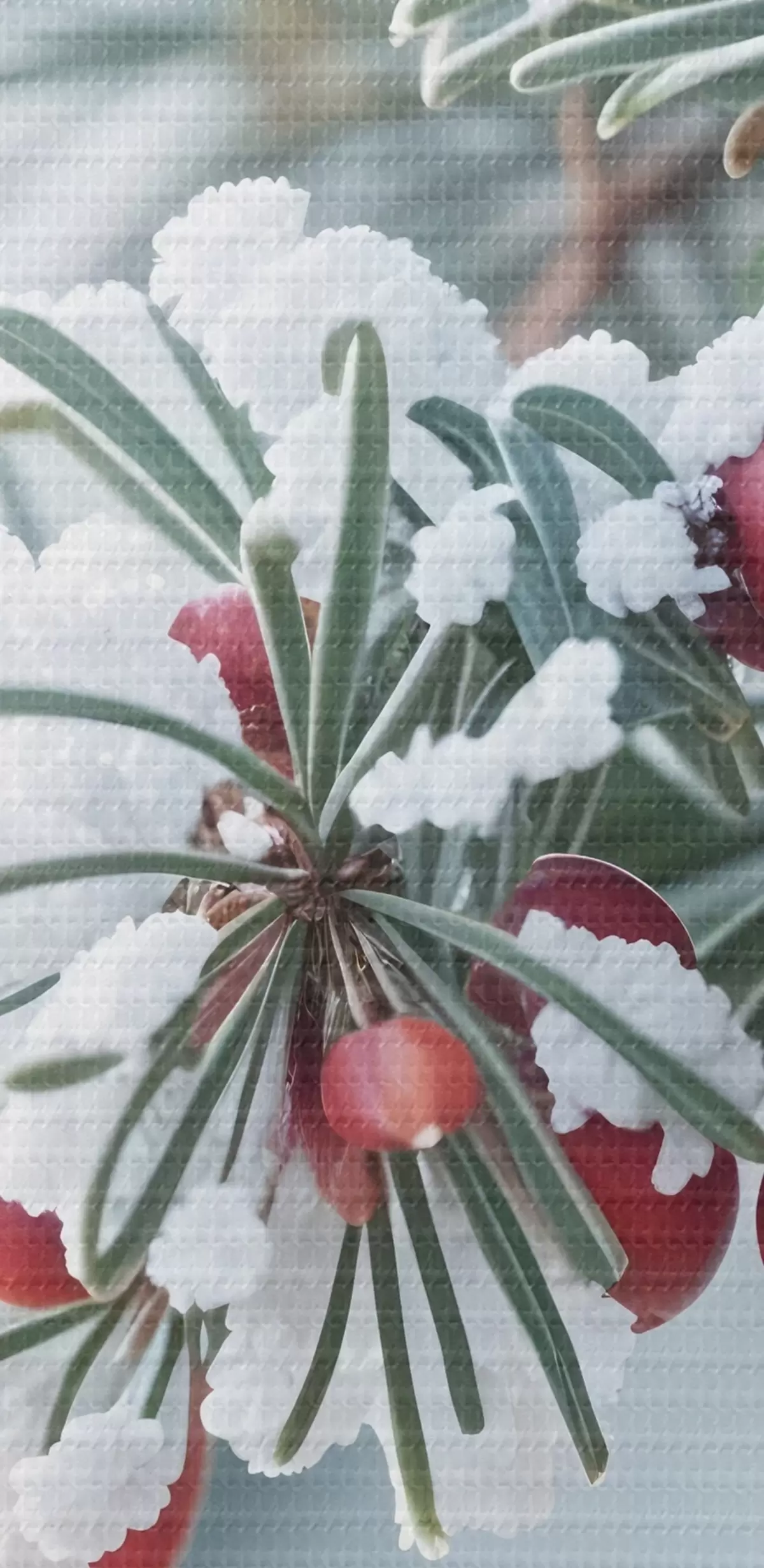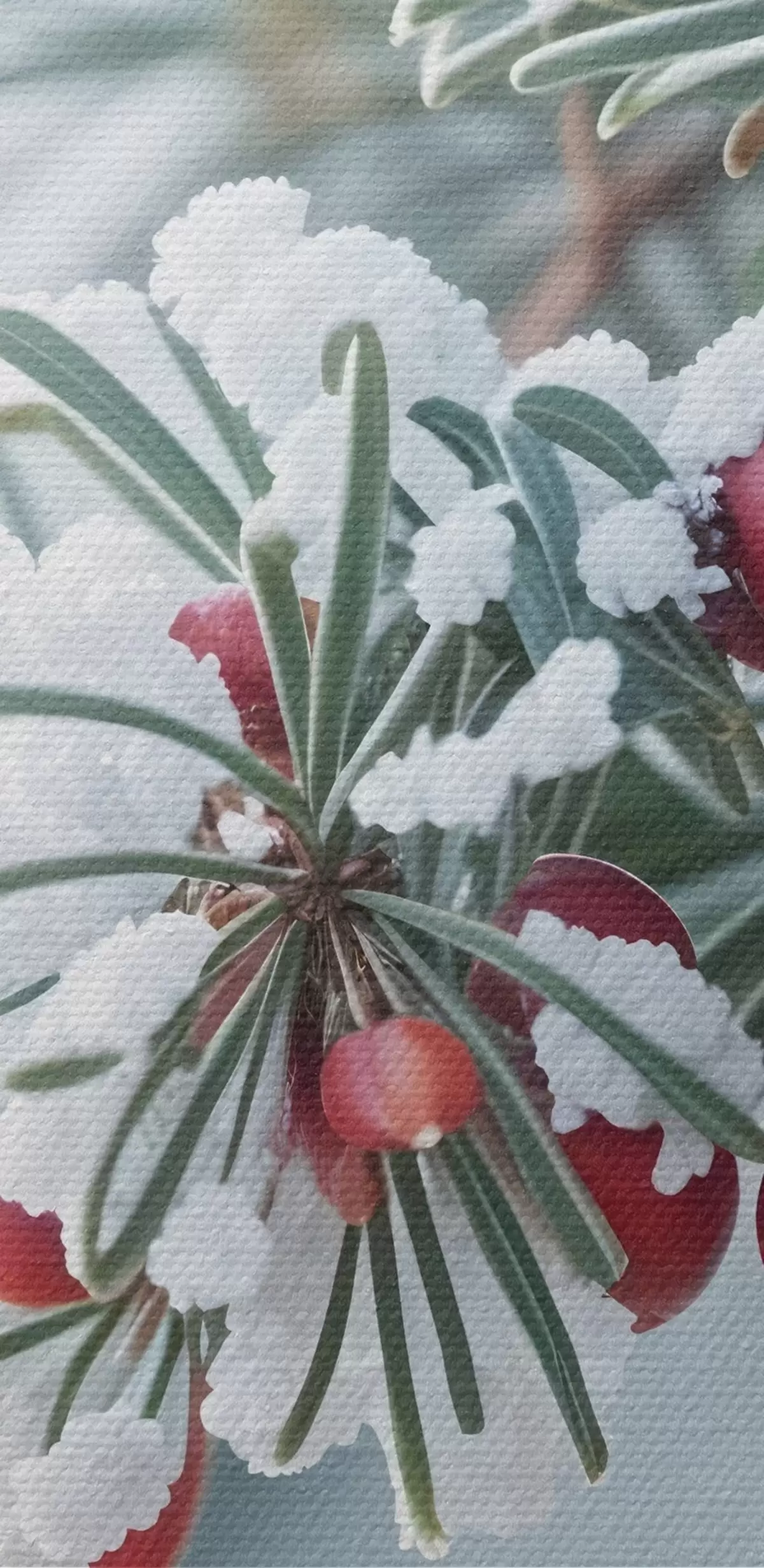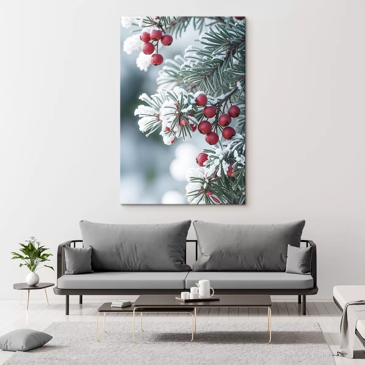 Pictură pe pânză Ramură de pin înzăpezită cu fructe de pădure roșii , scenă de iarnă Nr s42238