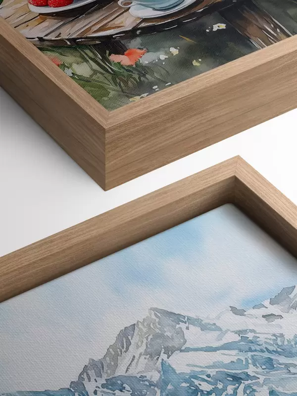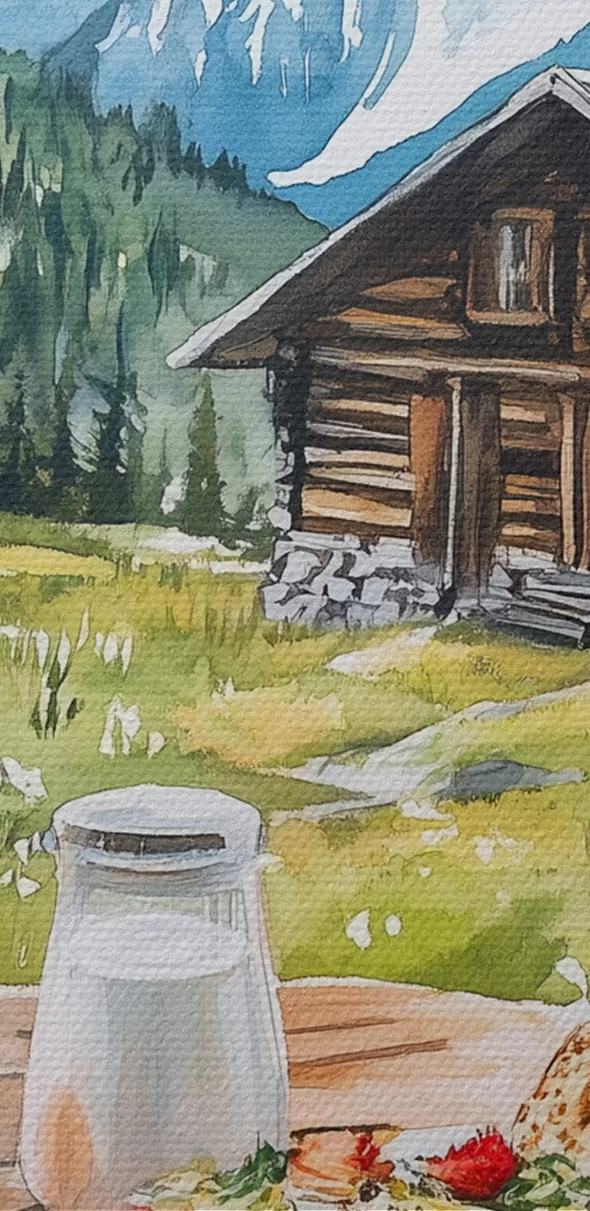 Tablouri Peisaje frumoase de vară cu munți, pădure și flori, mic dejun, stil acuarelă s42427