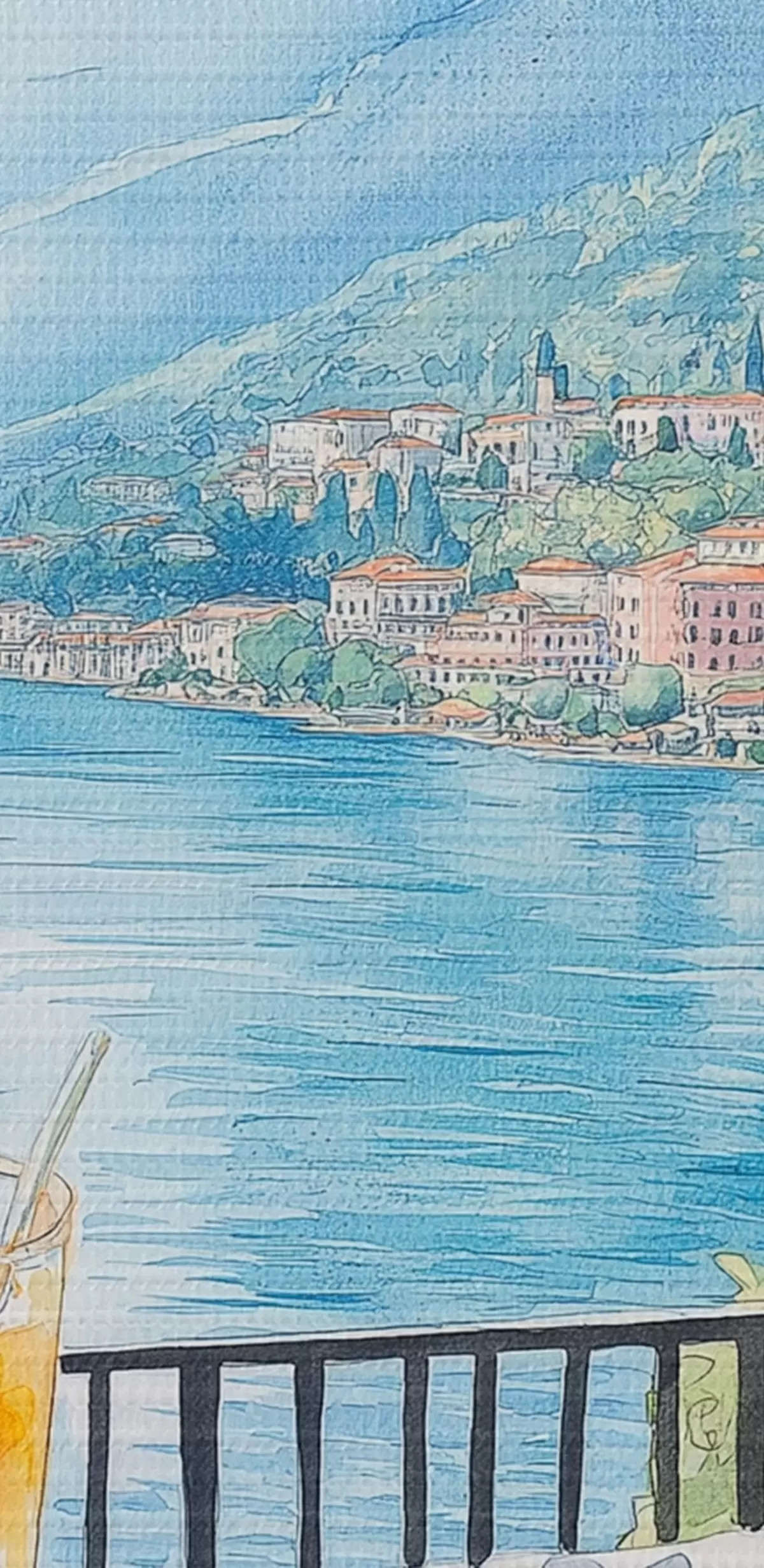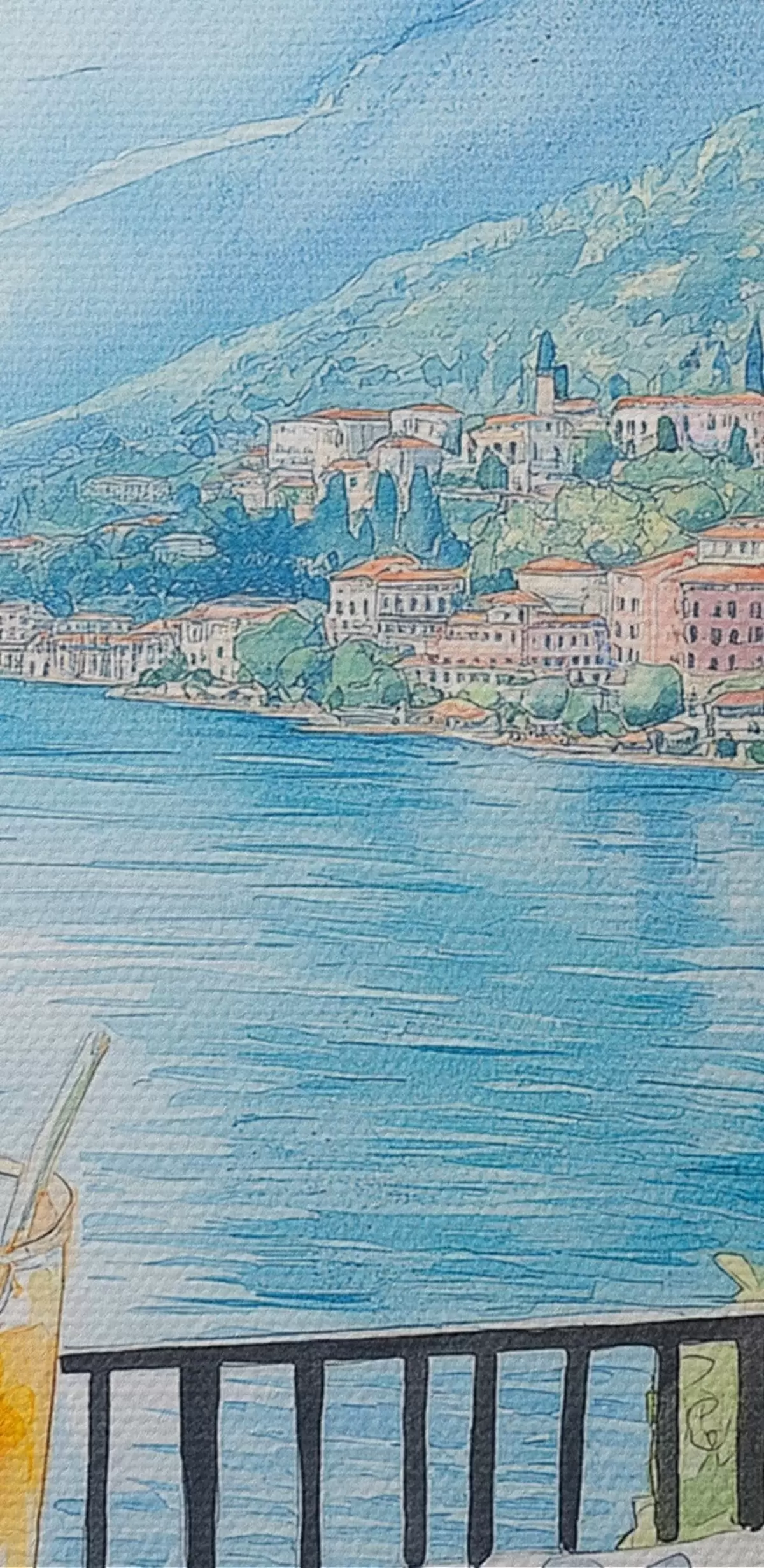 Pictură pe pânză Brunch în Italia, stil acuarelă, pizza margarita, lac, natură de vară Nr s42436