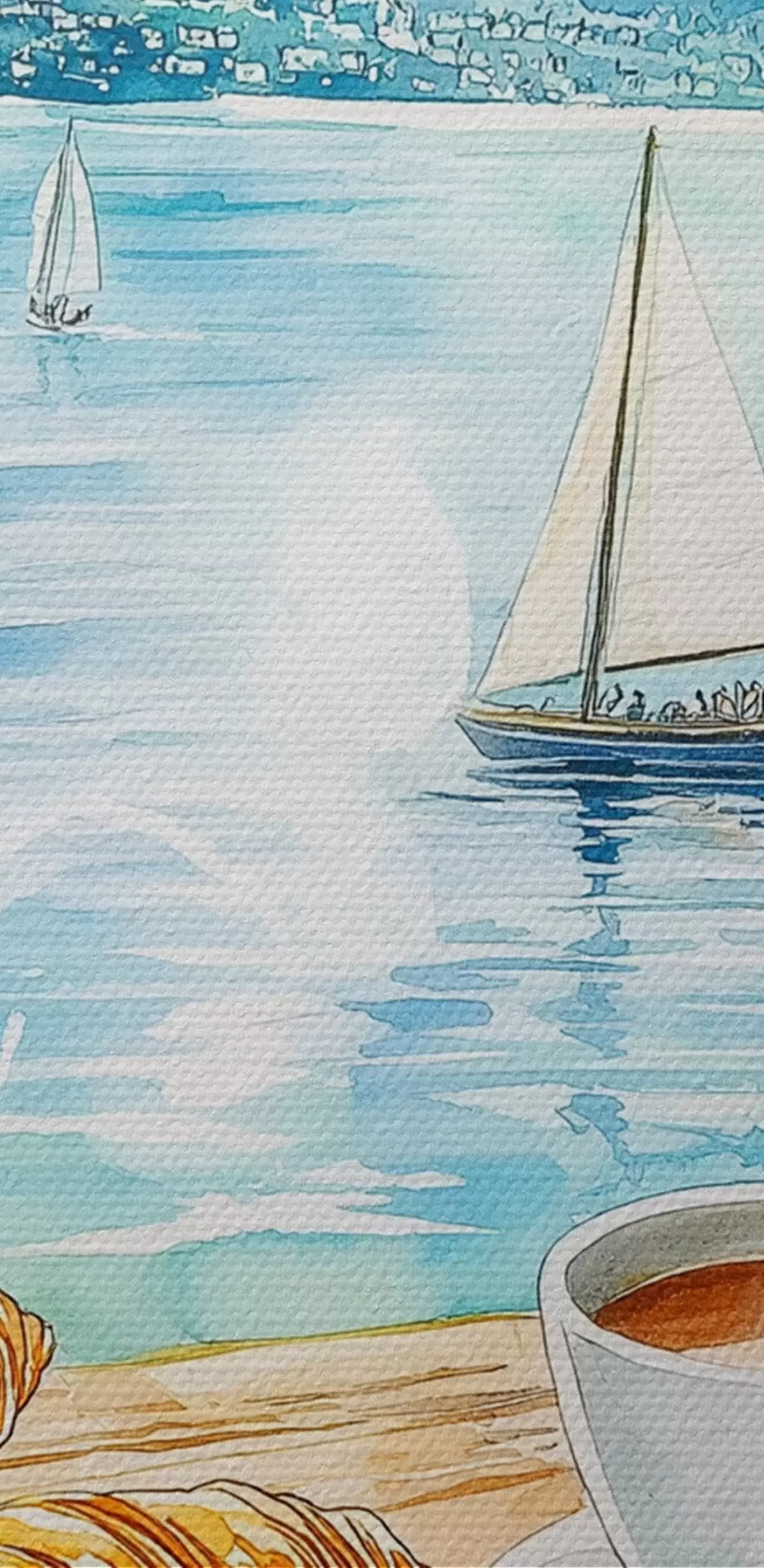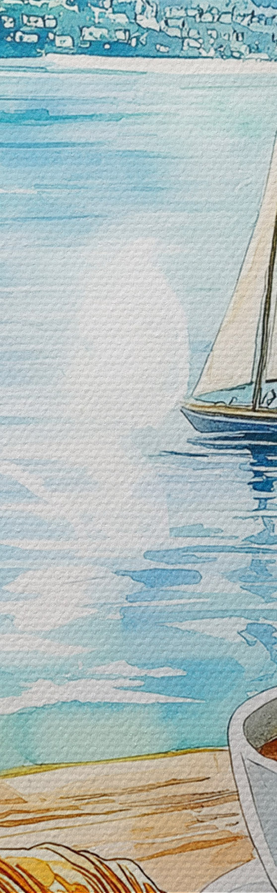 Pictură pe pânză Lac de vară cu bărci cu pânze, cești de cafea, croissante, stil acuarelă Nr s42441