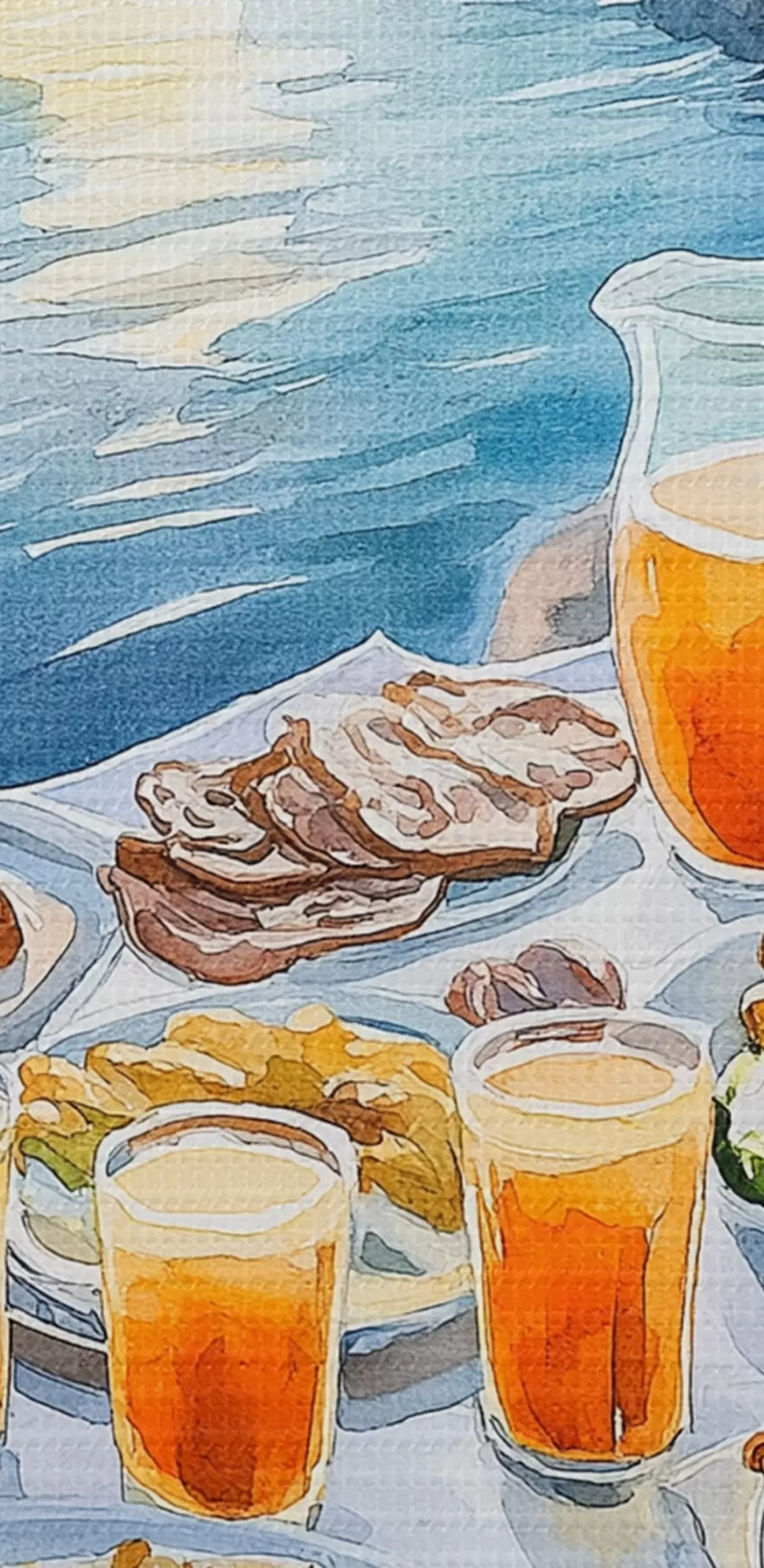 Pictură pe pânză Vocație romantică în Grecia, stil acuarelă, mic dejun, răsărit de soare Nr s42453