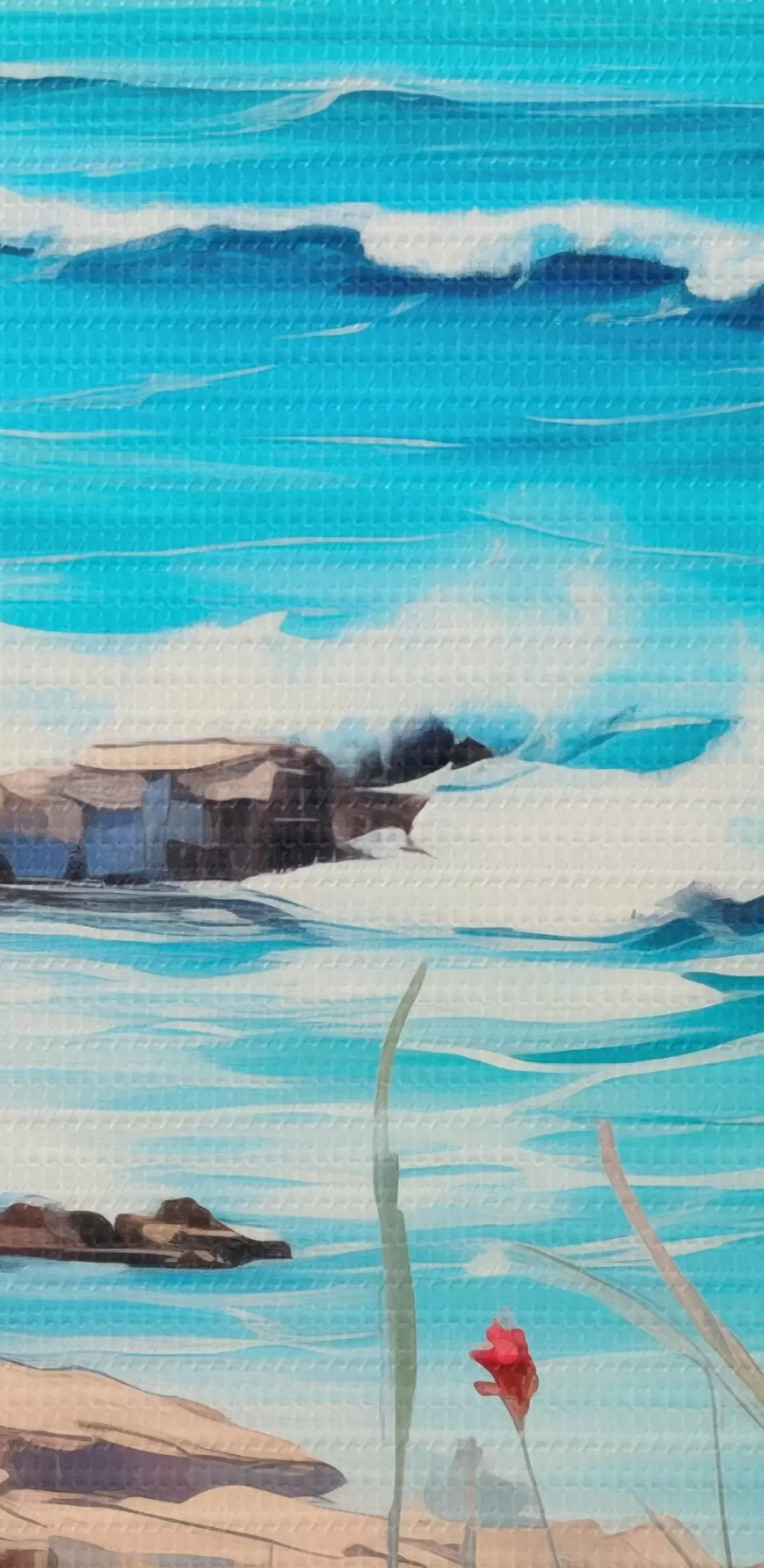 Pictură pe pânză Un peisaj marin cu valuri turcoaz, un țărm stâncos și flori strălucitoare în prim-plan sub un cer albastru senin. Nr s42568