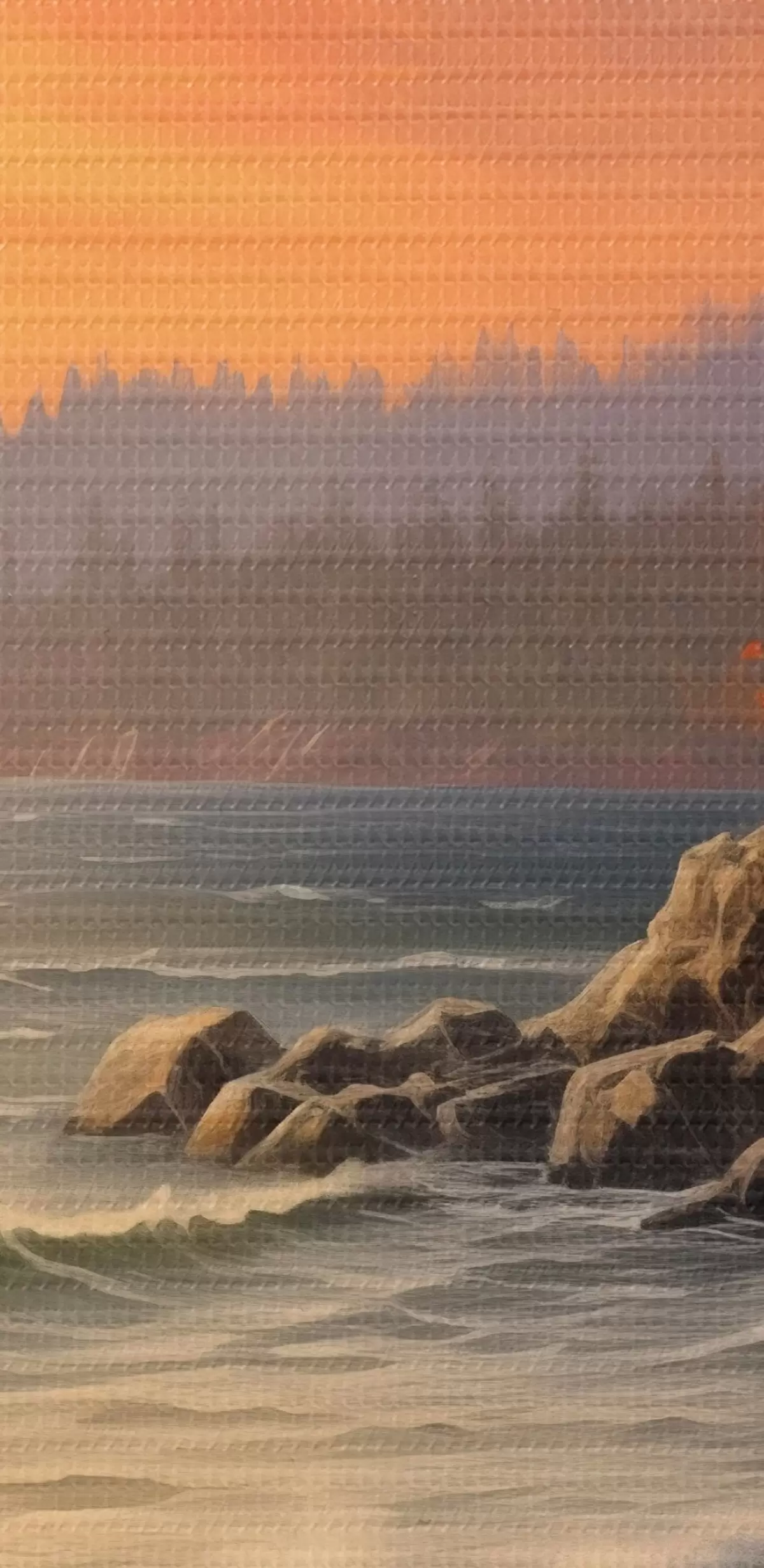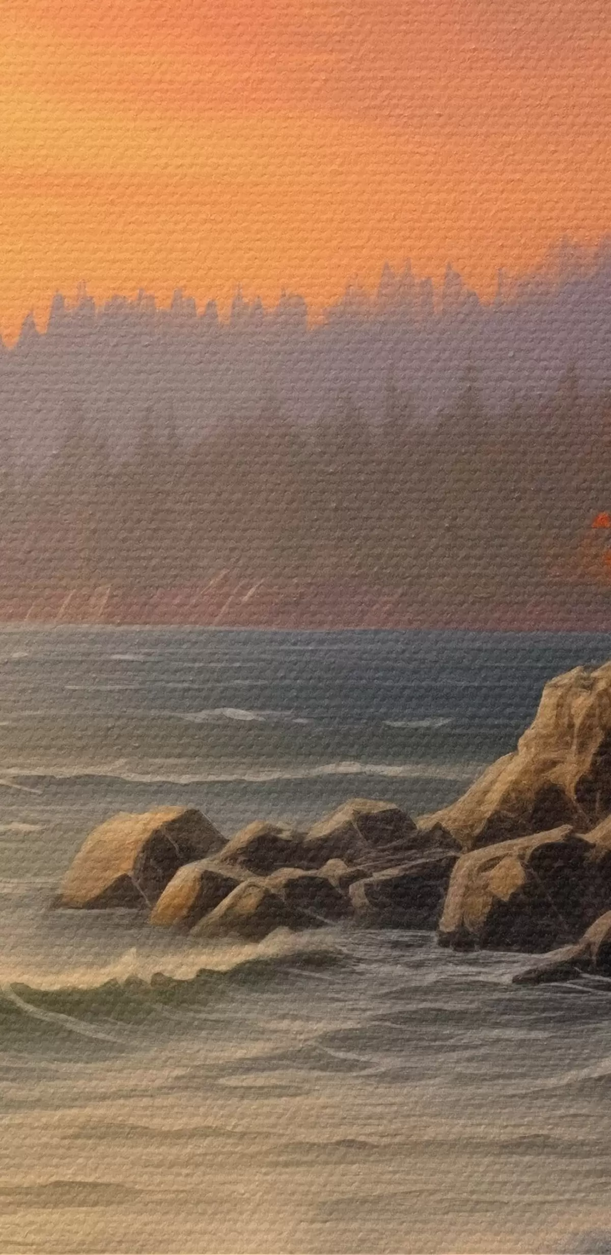 Pictură pe pânză Un apus de soare pe malul mării cu valuri, o pădure de pini și culori de toamnă în prim-plan. Nr s42571