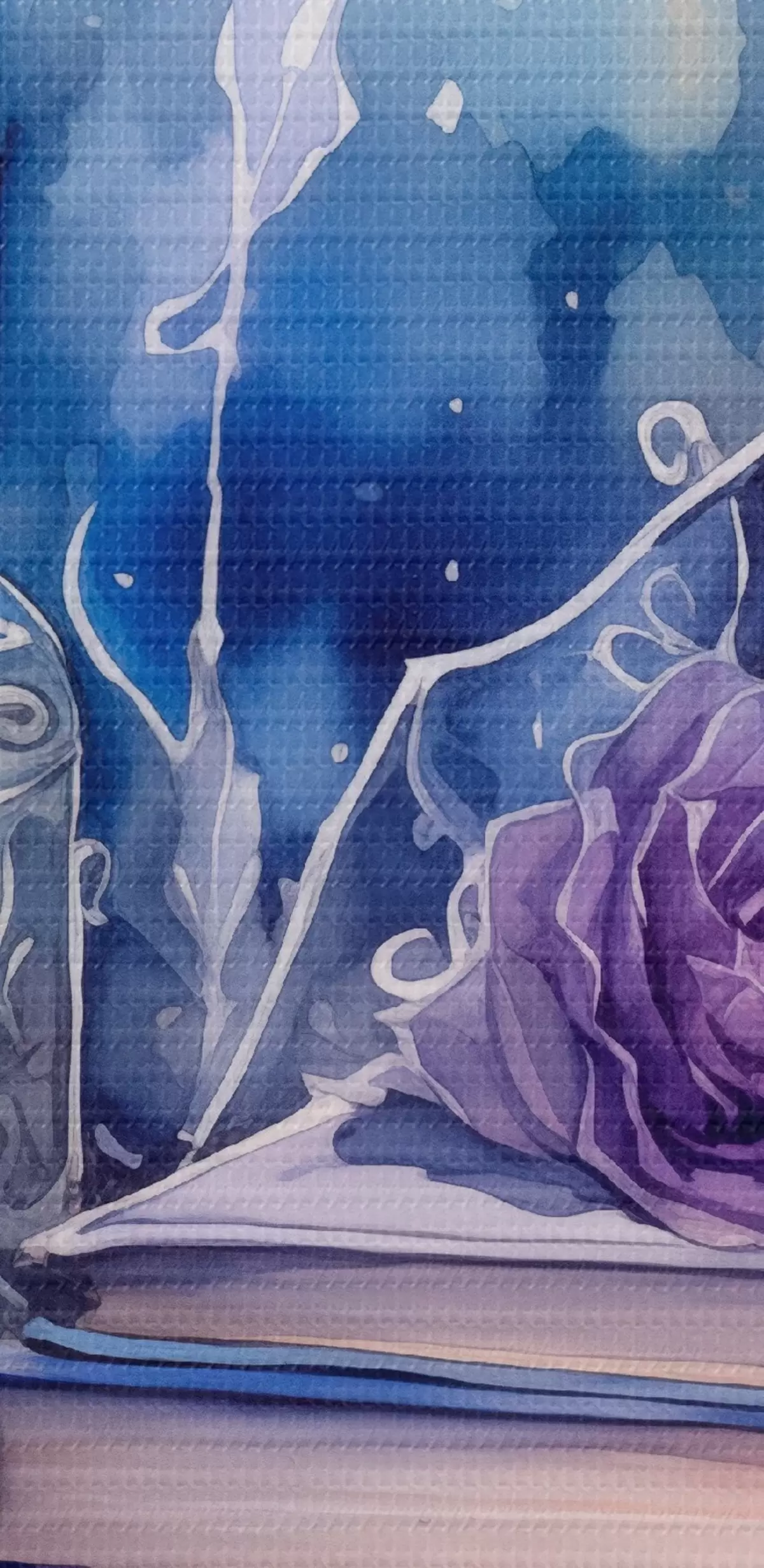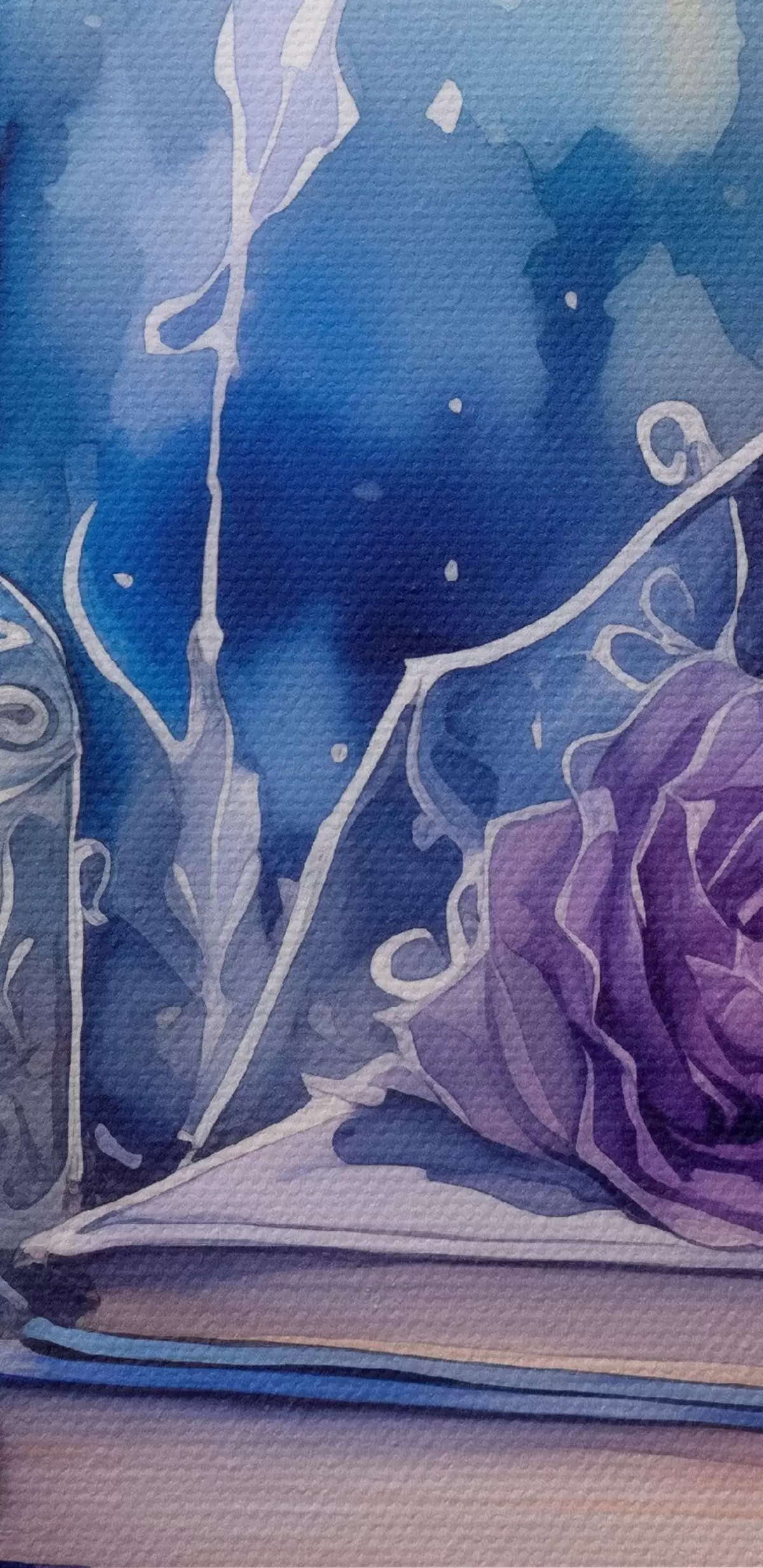 Pictură pe pânză O natură moartă cu cărți de epocă, sticle de sticlă în tonuri de albastru-violet și flori decorative. Nr s42574