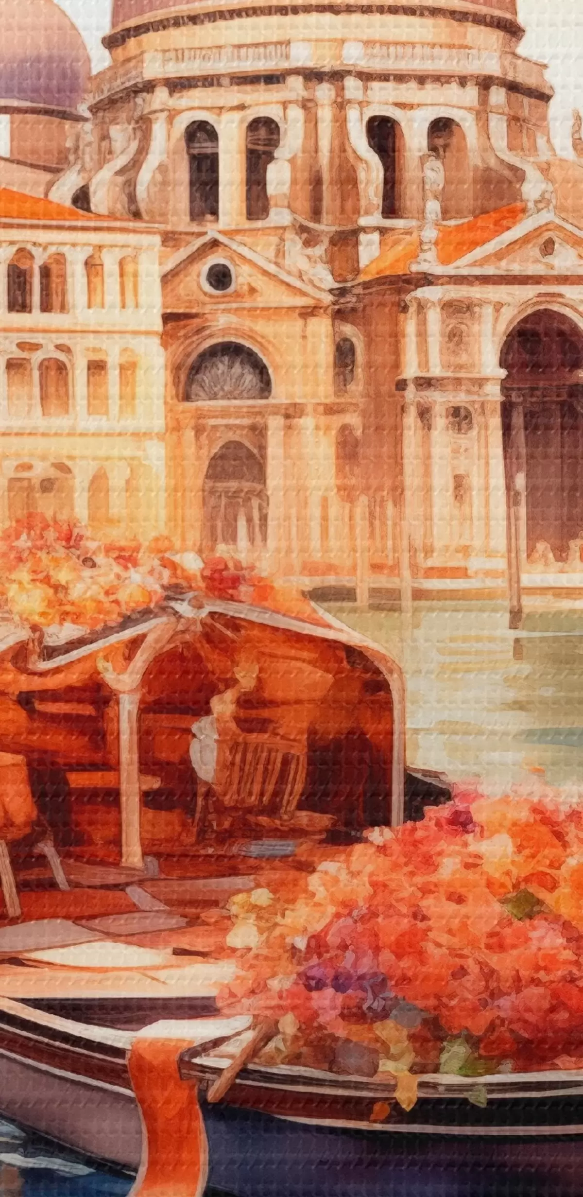 Pictură pe pânză O priveliște de toamnă a Veneției cu o gondolă înconjurată de frunze portocalii și roșii strălucitoare, cu reflexii ale clădirilor în apa calmă a canalului. Nr s42576