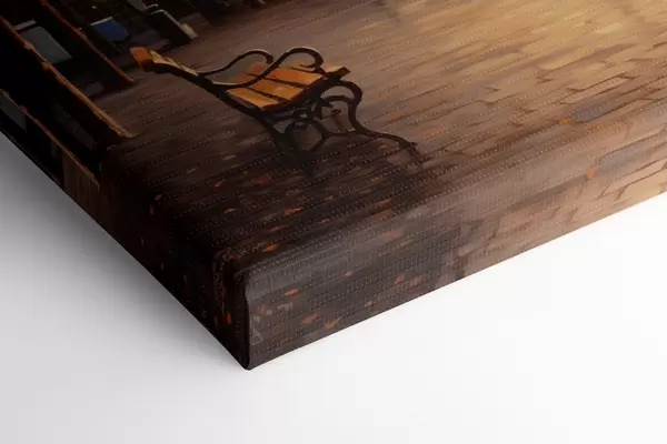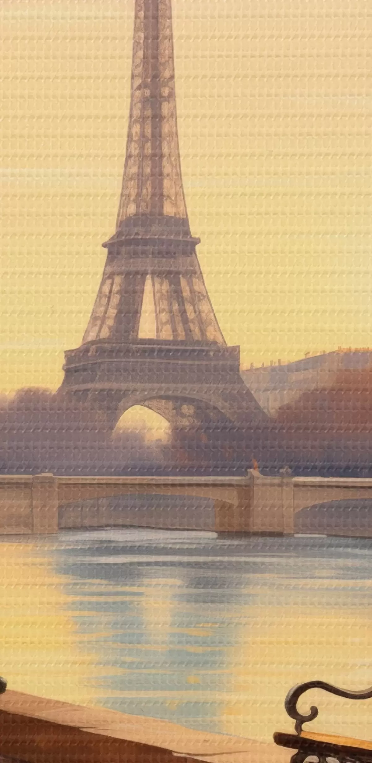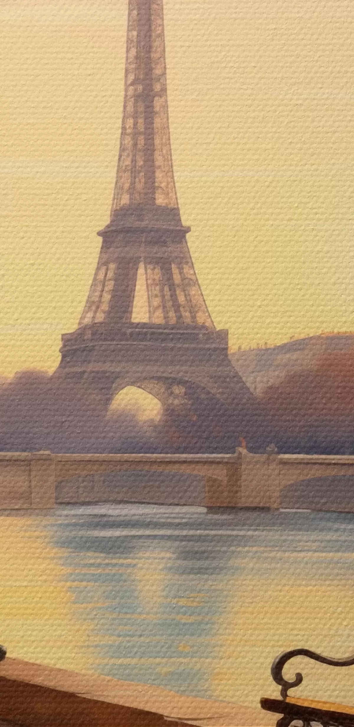 Pictură pe pânză Toamna la Paris, cu vedere spre Turnul Eiffel, malurile Senei acoperite cu frunze, bănci și felinare care contribuie la atmosfera romantică. Nr s42577