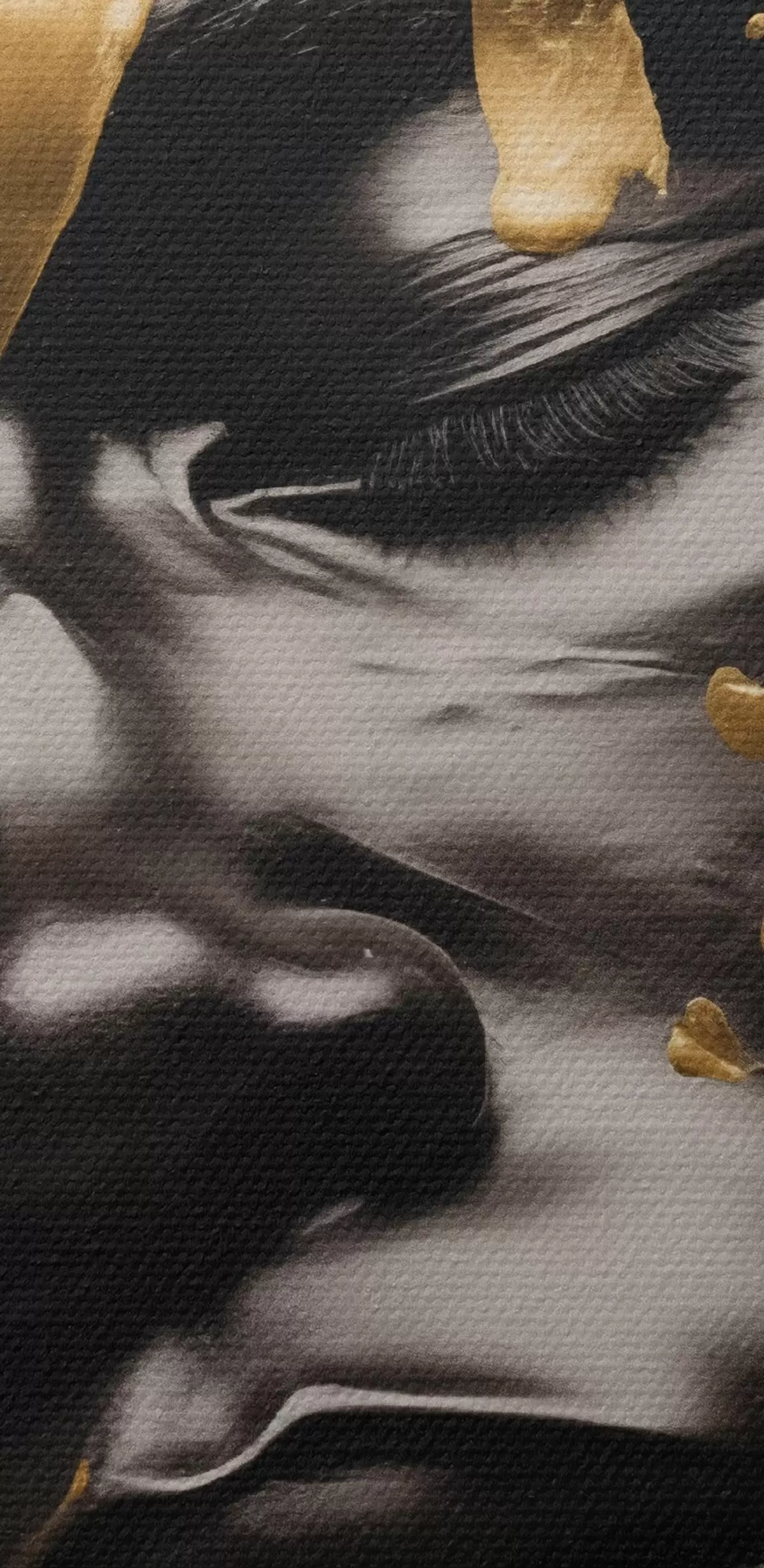 Tablouri Un portret abstract al unui bărbat în tonuri netede de alb-negru, evidențiat de tușe luminoase în culori calde care creează un efect dinamic. s42623