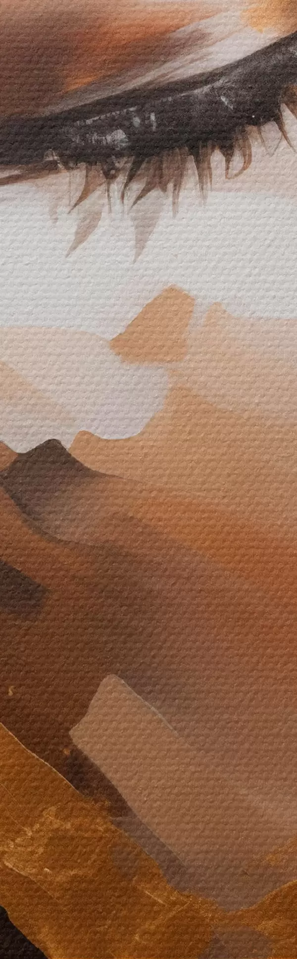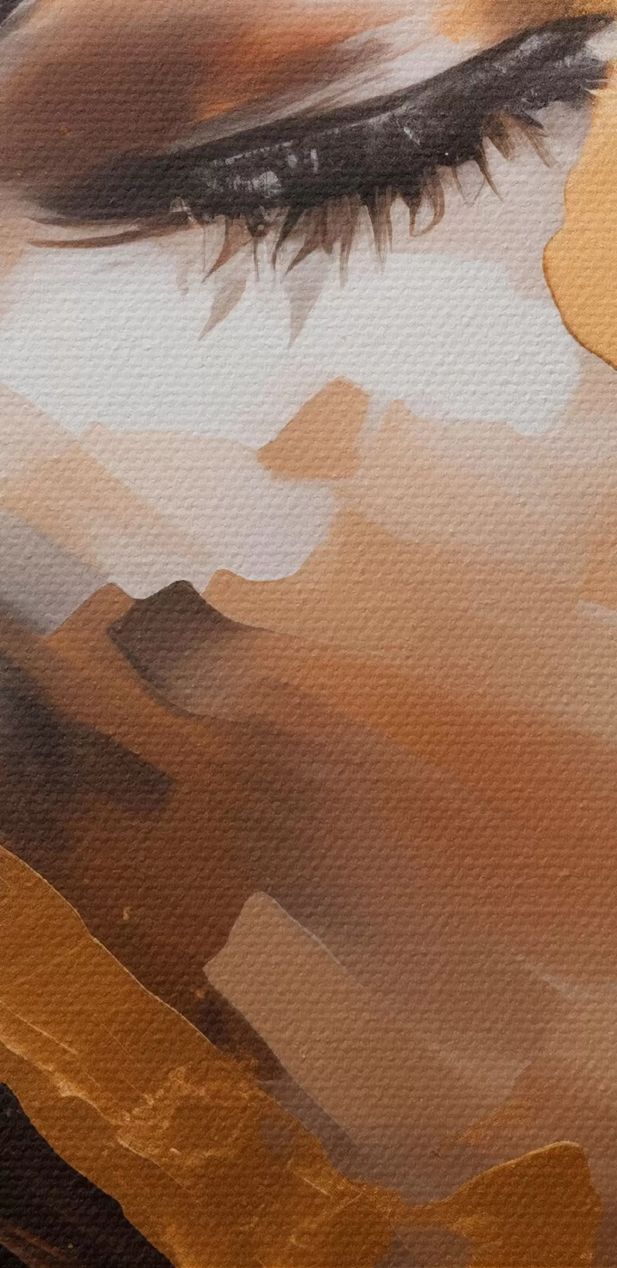 Pictură pe pânză Un portret abstract al unei femei cu o expresie facială blândă, redat în tonuri calde cu tușe dinamice care adaugă profunzime și emoție. Nr s42627