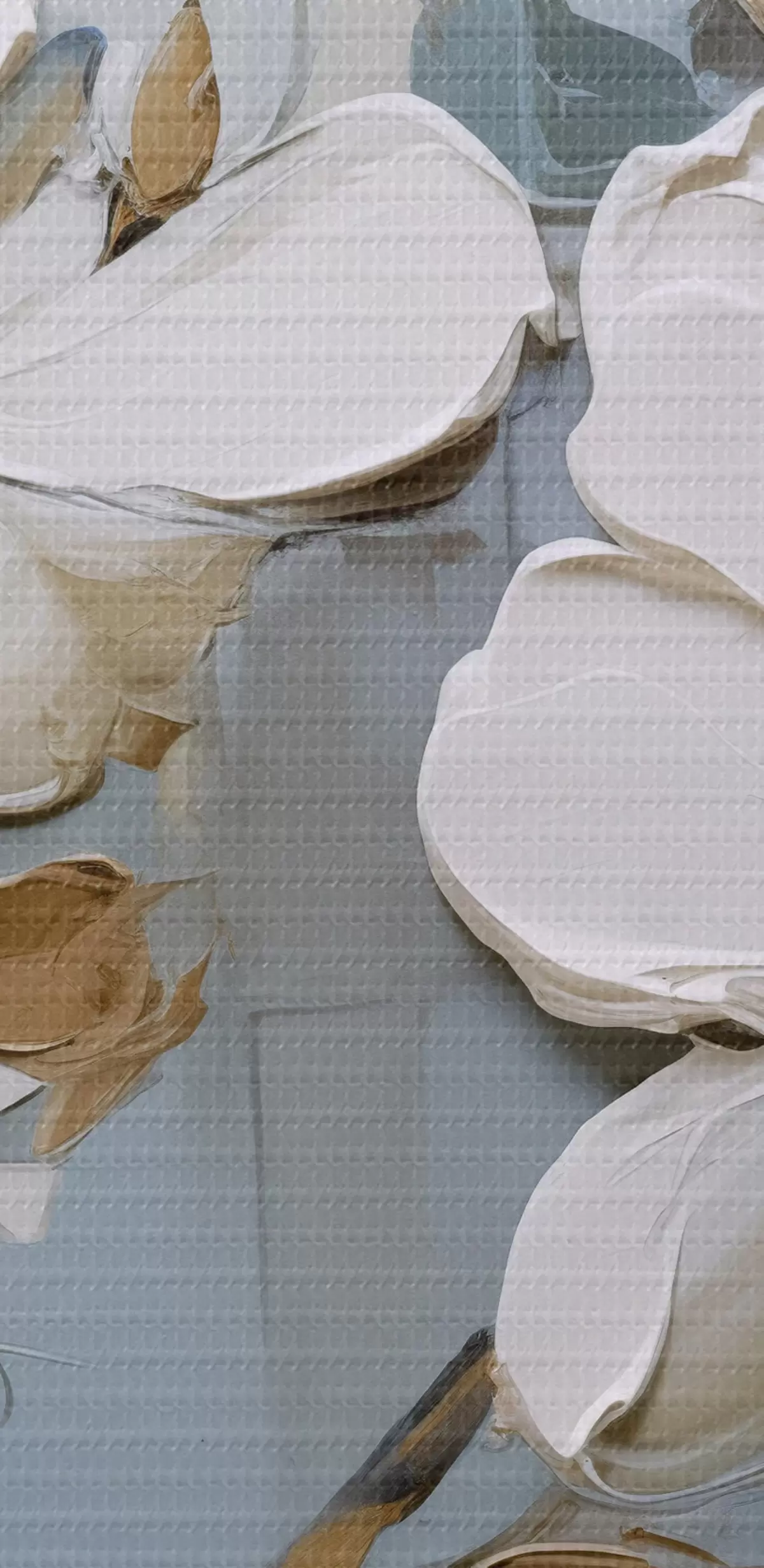 Pictură pe pânză Flori albe magnolia cu petale texturate și frunze maro pe un fundal albastru moale pictură în ulei imitație Nr s42711