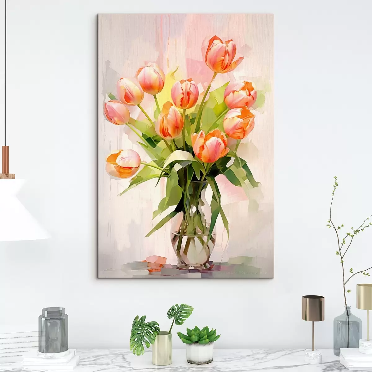 Pictură pe pânză Natură moartă pictată cu lalele într-o vază de sticlă pe un fundal deschis Nr s42940