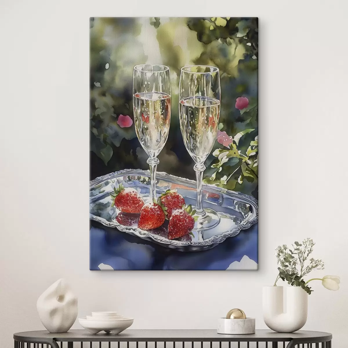 Pictură pe pânză Pahare de șampanie festive și spumante cu căpșuni pe tavă Nr s43057