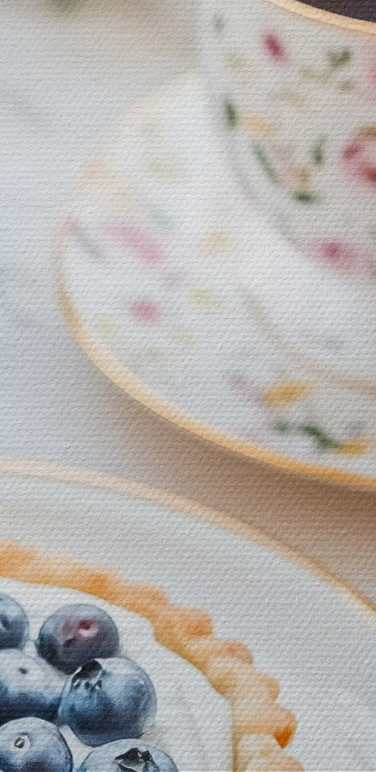 Pictură pe pânză Prăjitură cu afine cu ceașcă de ceai, stil boho, trandafiri roz Nr s43066