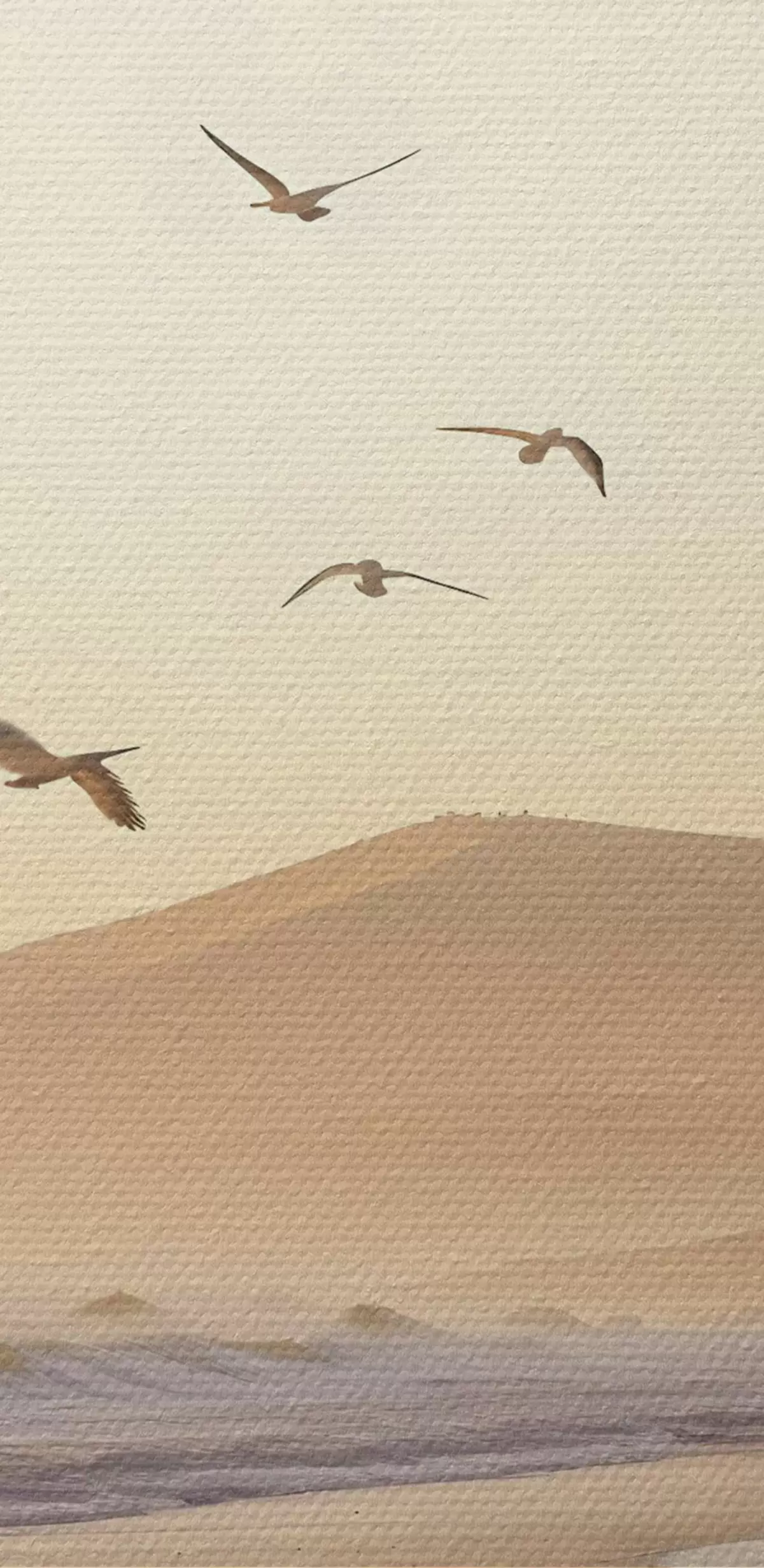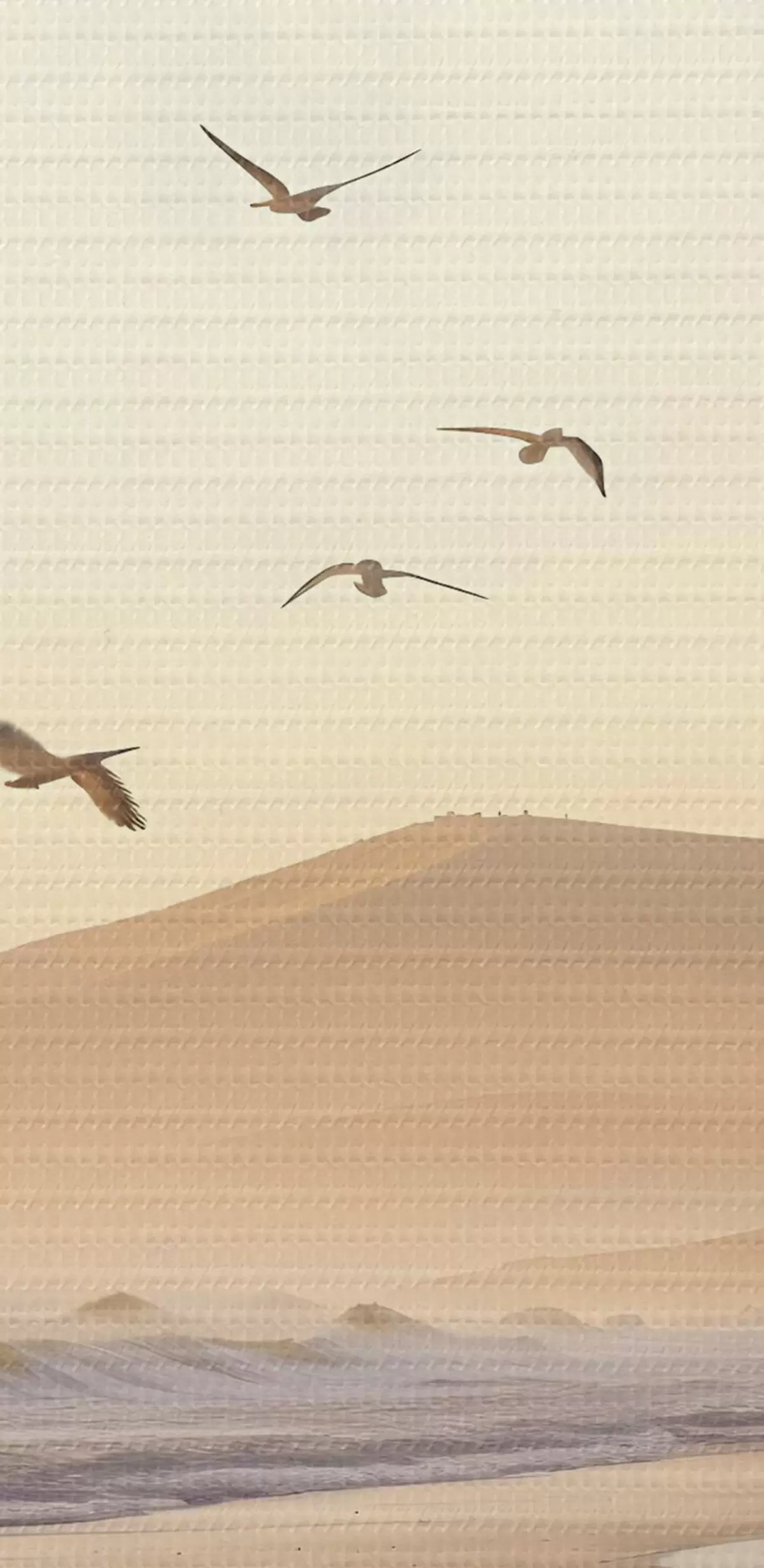 Tablouri Păsări care zboară deasupra plajei cu ocean, munți în fundal, culori calde, paletă pastel moale  s43162