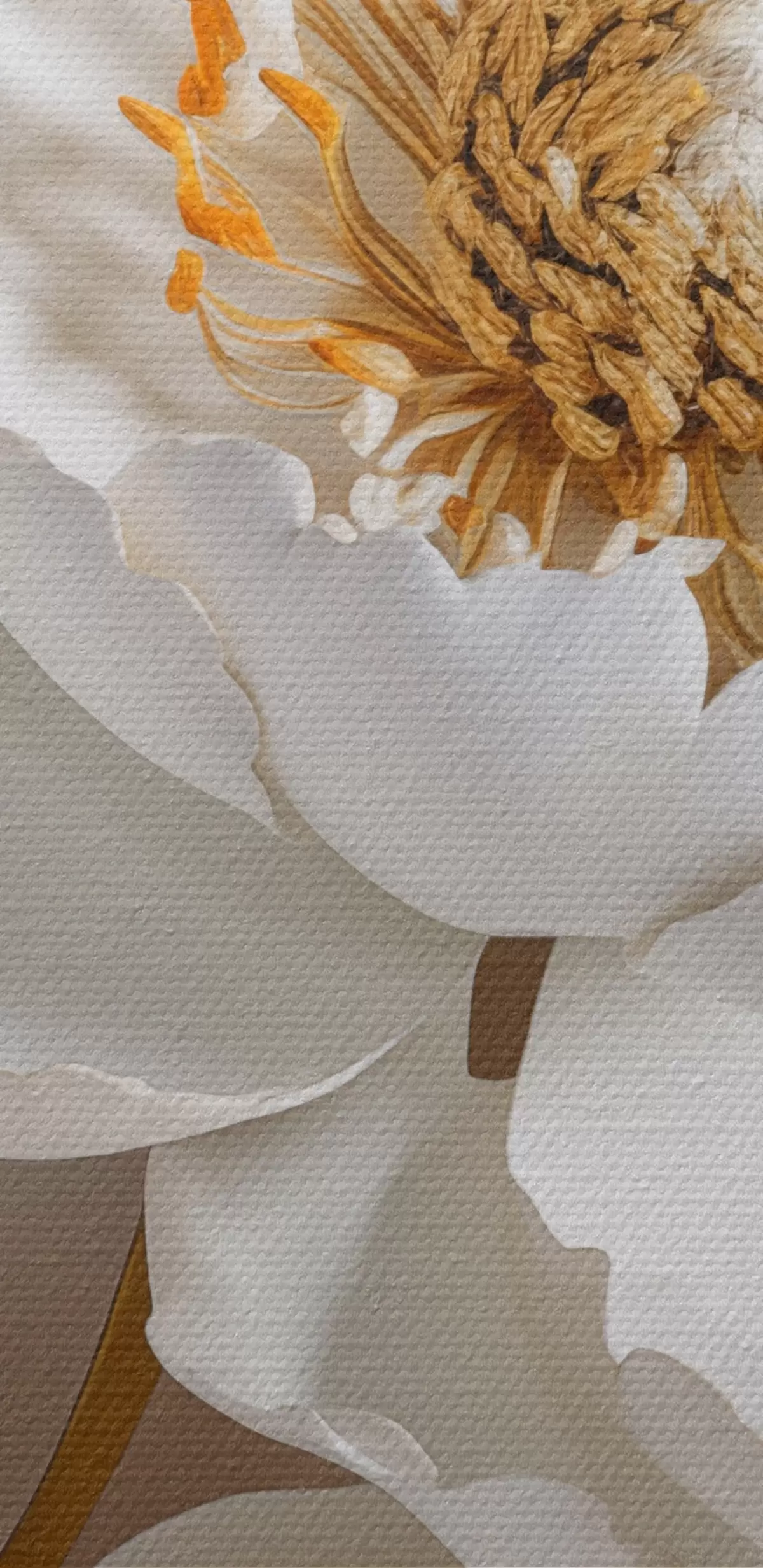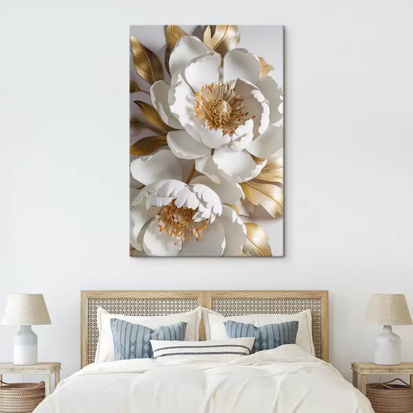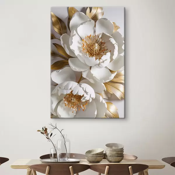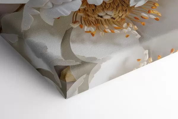 Pictură pe pânză Alb delicat detaliate flori de bujor decorative cu frunze galbene, fundalul este o culoare gri deschis Nr s43176