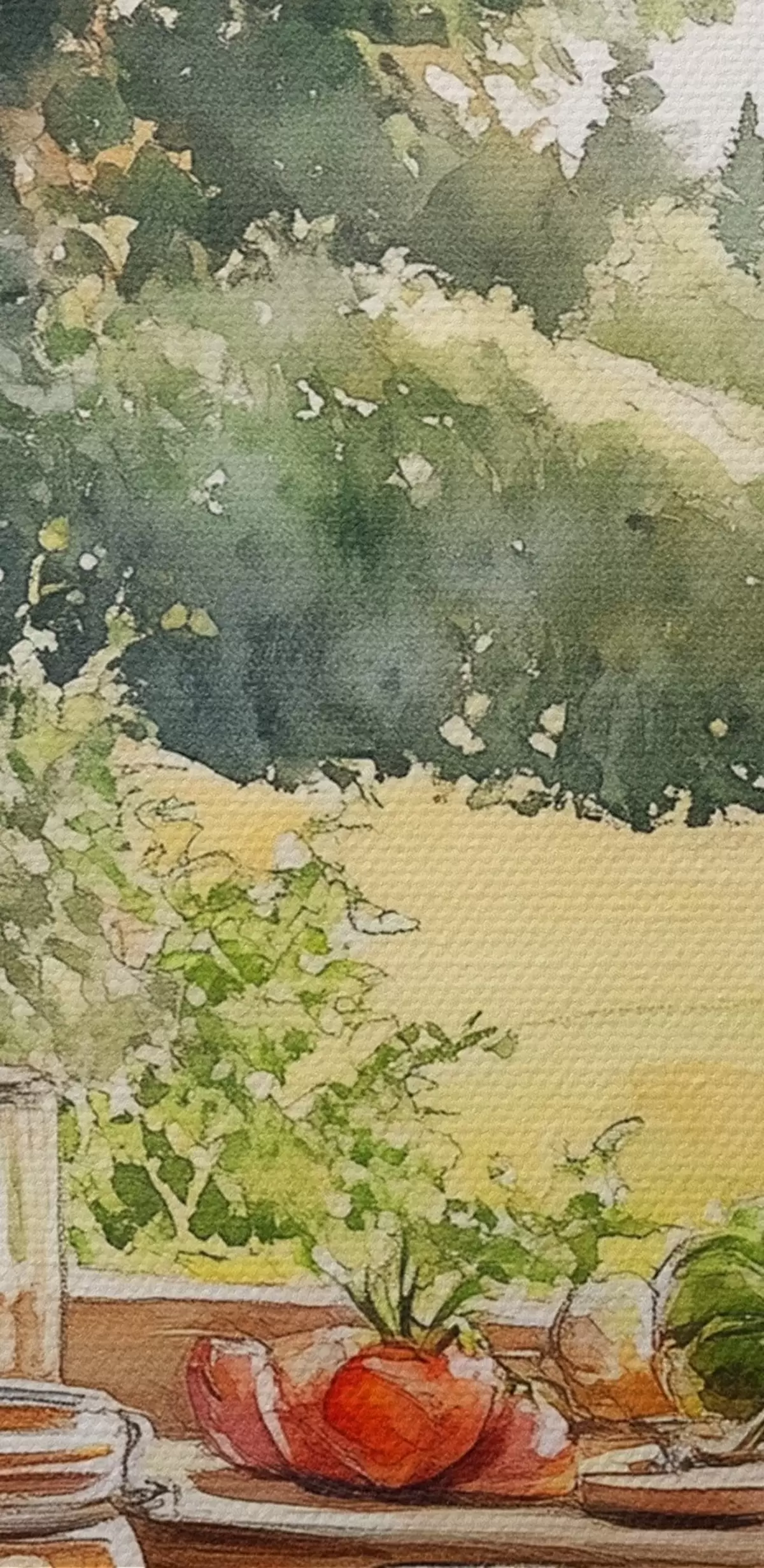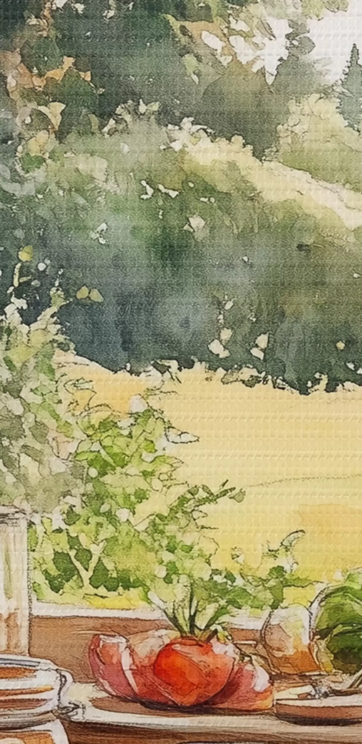 Tablouri Estetica satului, casa din lemn, natura de vara, legume, stil acuarelă s43185