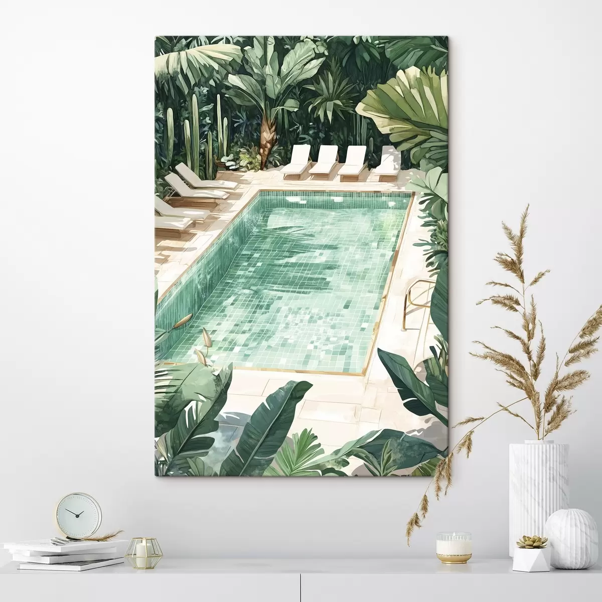 Pictură pe pânză Piscină de vară în grădina verde, stil de epocă, acuarelă Nr s43189