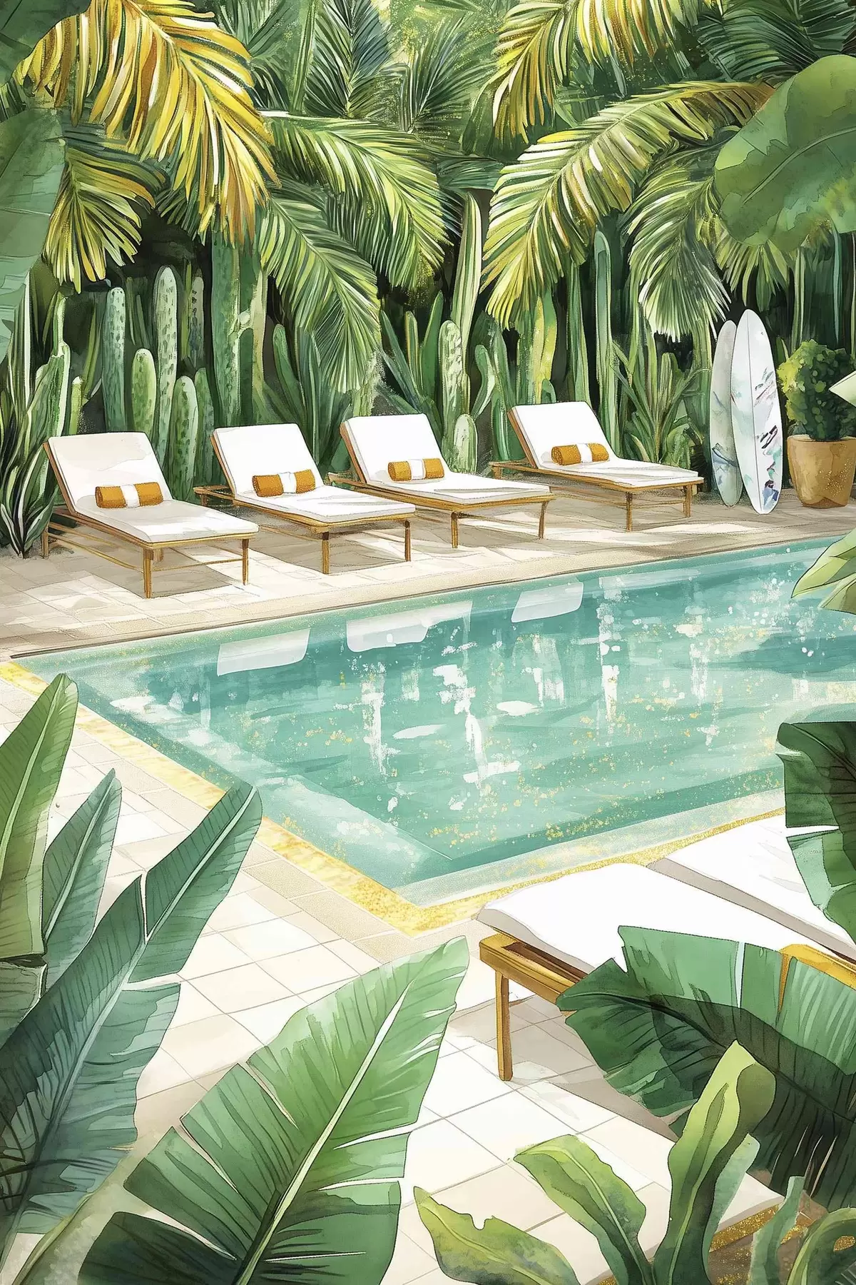 Tablouri Natură tropicală, grădină, piscină de vară, surfing, stil acuarelă s43190