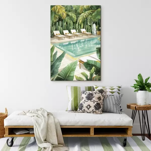 Pictură pe pânză Natură tropicală, grădină, piscină de vară, surfing, stil acuarelă Nr s43190